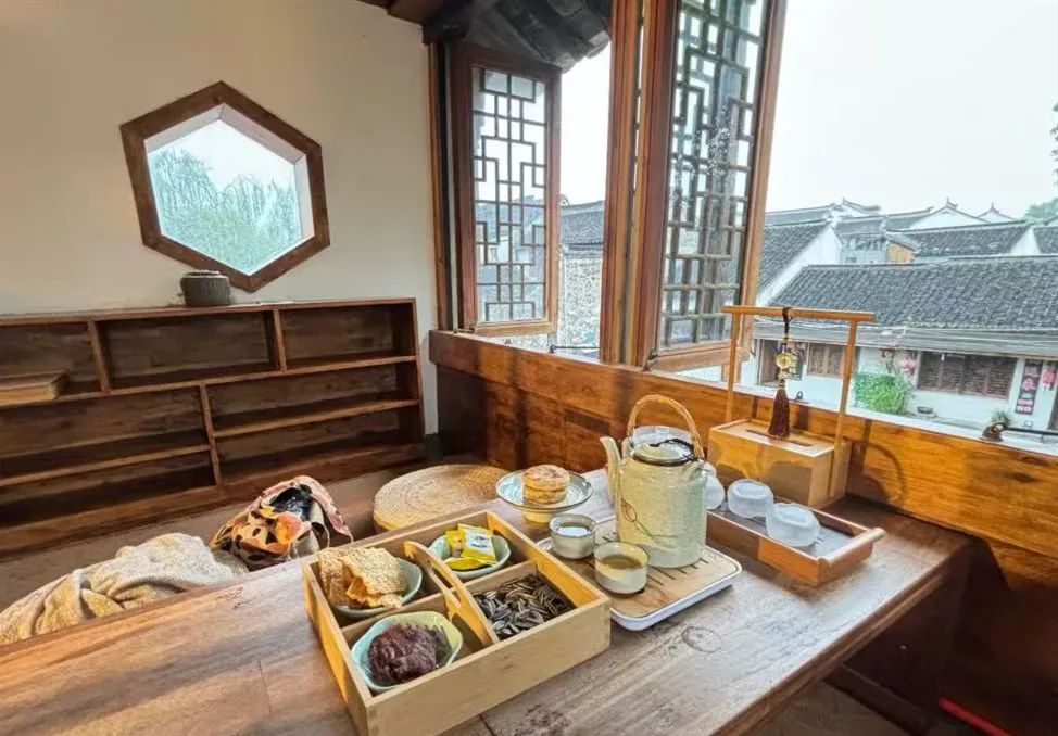 茶楼的二层,古朴而典雅,临窗而坐,小风轻拂,流水潺潺,桥影婆娑,仿佛时间在这一刻凝固。墙上“窥月洞”依旧,见证着往昔的秘密与浪漫。这里,不仅是品茗的好去处,更是感受古镇风情、领略水乡文化的理想场所。