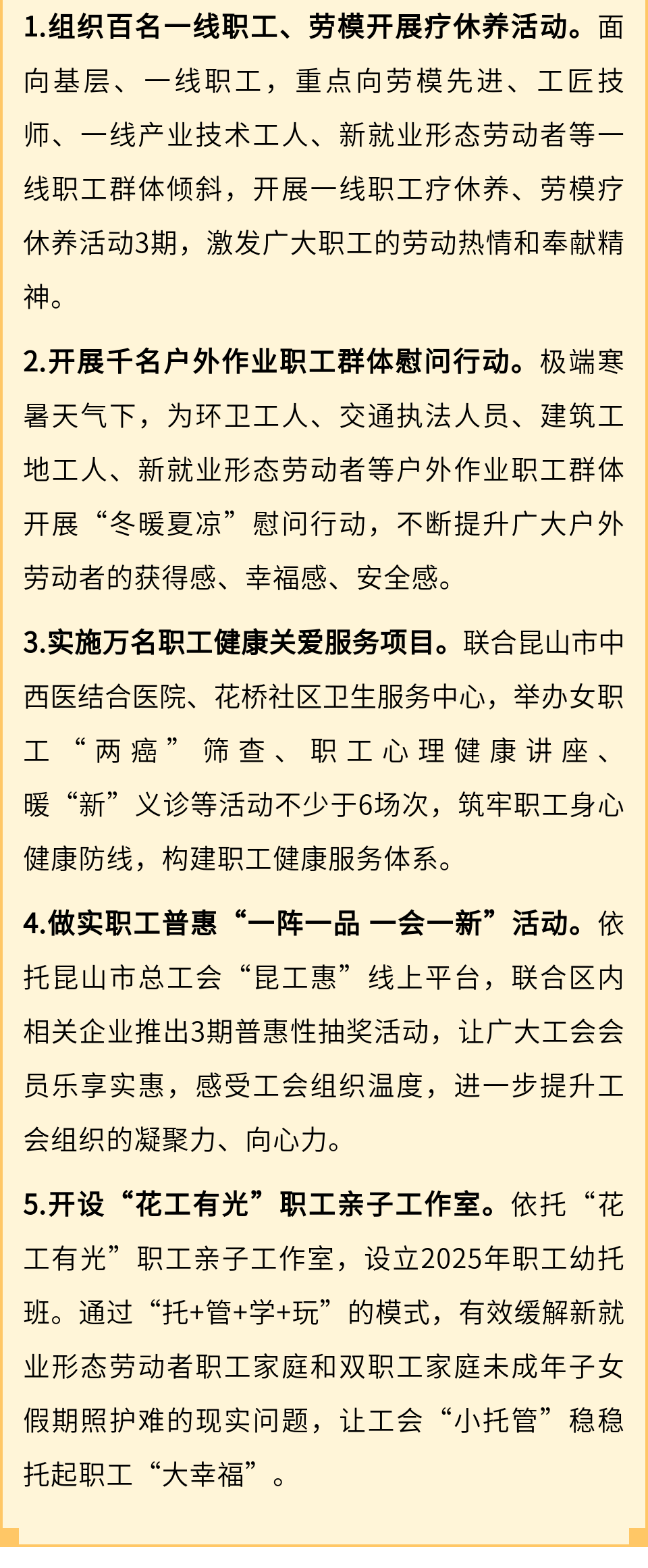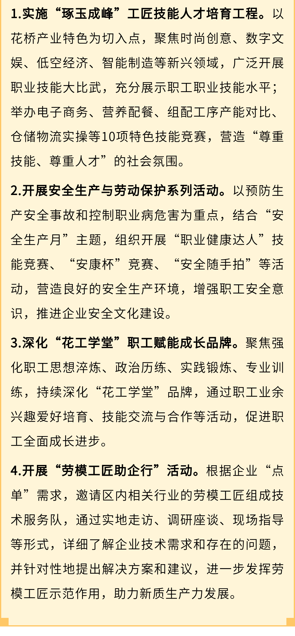2025年适逢中华全国总工会成立100周年。为庆祝第135个五一国际劳动节,进一步弘扬劳模精神、劳动精神、工匠精神,凝聚“劳动创造幸福”的广泛社会共识,激励全区广大职工以昂扬斗志、强烈担当、务实作风为建设一流国际商务区,加快实现高质量发展“第二次飞跃”贡献“工”力量,花桥经济开发区总工会将围绕“五大篇章”开展“百年荣光·聚梦花桥”职工庆五一系列活动。