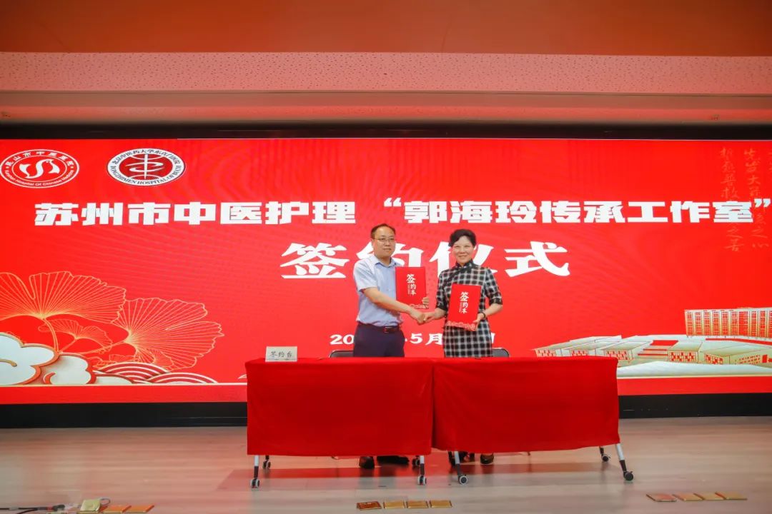 揭牌仪式:苏州市卫健委中医处处长潘红英与郭海玲教授共同为工作室揭牌,标志着苏州市中医护理传承工作室首次正式落地昆山。