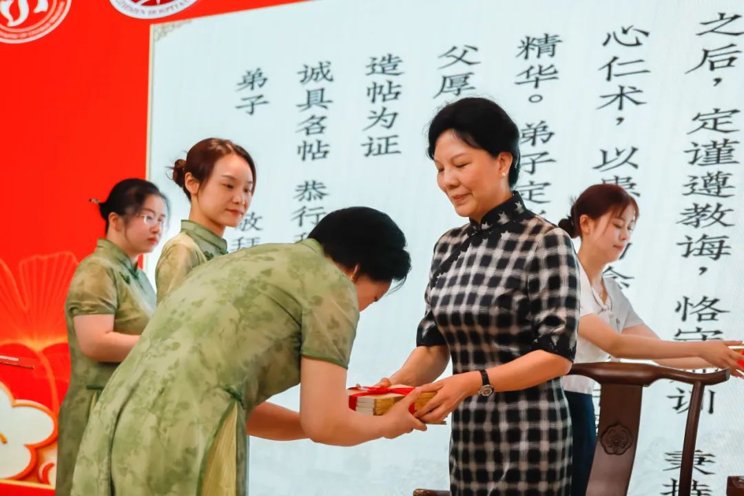 郭教授向传承弟子赠典籍及回徒贴,并寄语:“中医护理需守正创新,以循证实践连接传统与现代。”