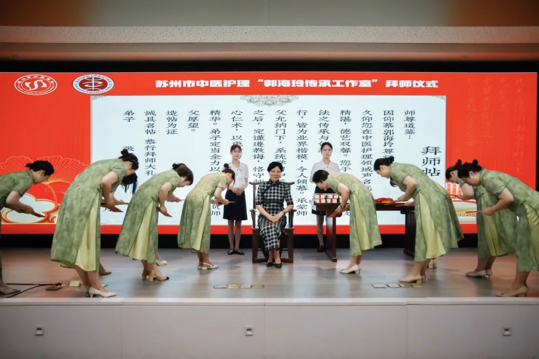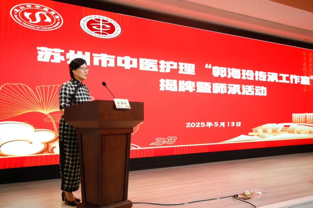 5月13日上午,苏州市中医护理领域迎来重要里程碑——“郭海玲传承工作室”揭牌暨师承活动在昆山市隆重举行。本次活动由昆山市中医医院举办,苏州市卫健委、昆山市卫健委指导,旨在通过名医引领、师承培养,推动中医护理技术的标准化传承与创新性发展。苏州市及昆山市卫健委领导、昆山市中医医院院领导、相关职能科室负责人和护士长、传承弟子出席。活动由昆山市中医医院副院长洪嵘主持。