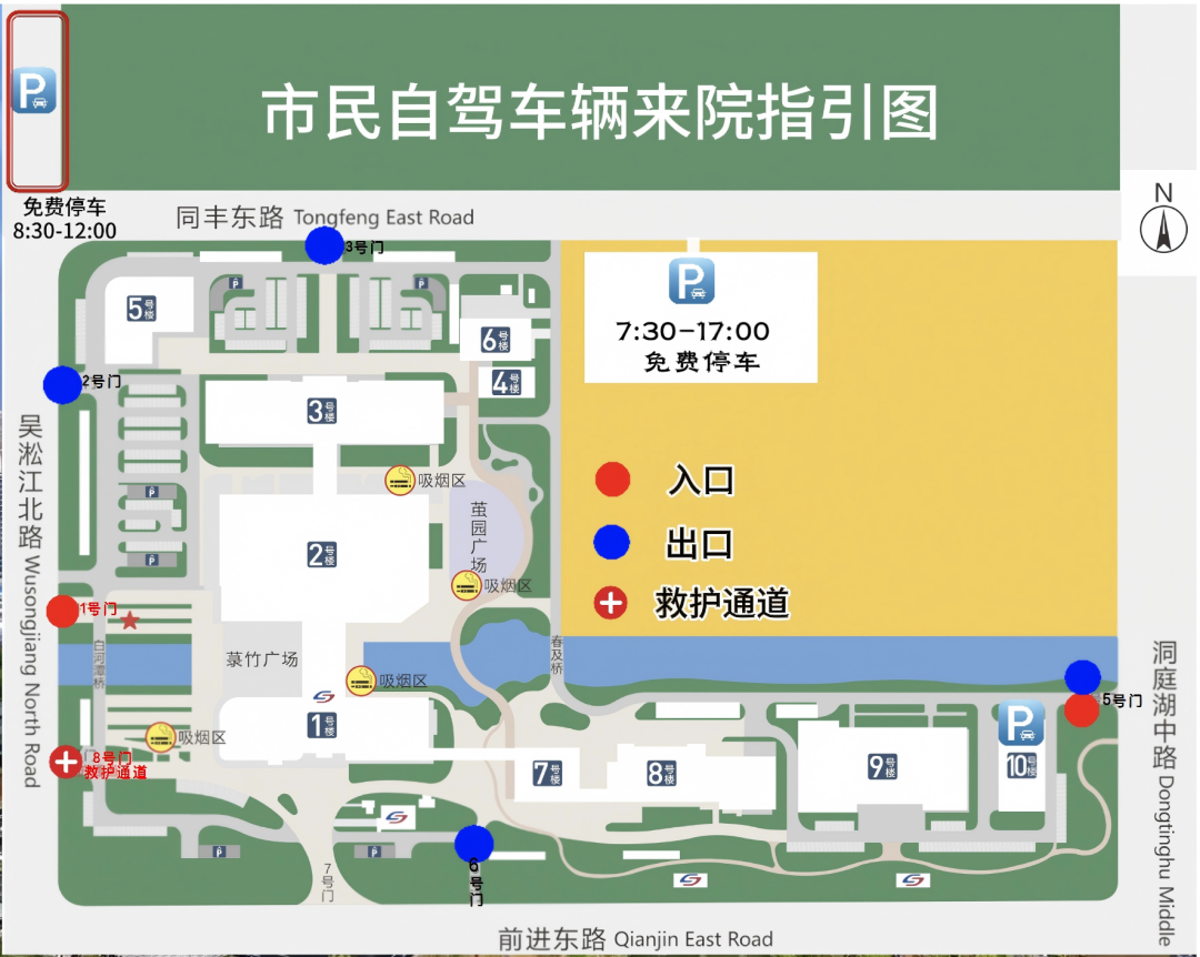 4. 院区西侧(吴淞江路)及院区北侧(同丰路至南浜路)两侧路段在上午8:30-12:00可有部分停车位;
