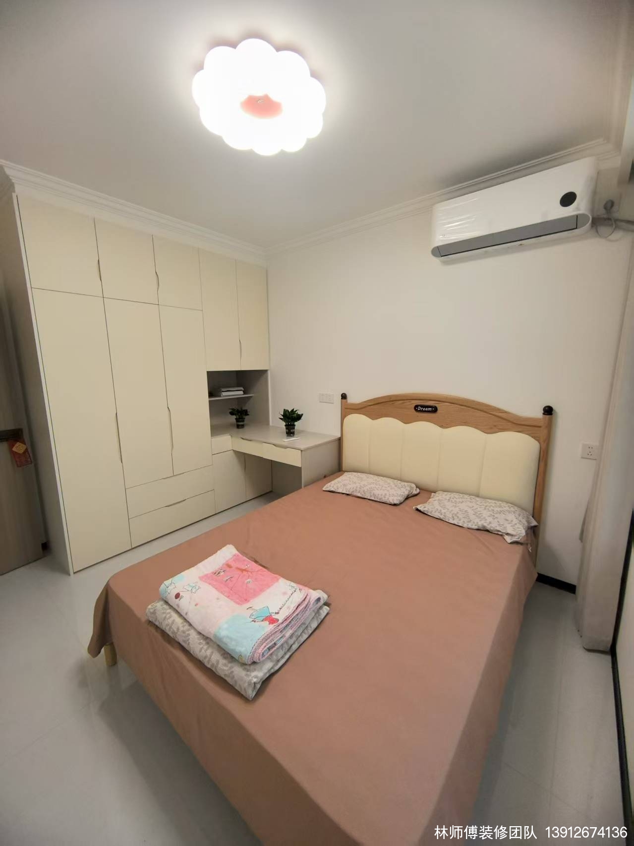 主卧走简约路线,一面墙的衣柜提供了充足的收纳空间,换季的衣物、被褥都能轻松收纳。顶部装了一盏简约的吸顶灯,光线均匀不刺眼。搭配一张实木床,简洁大方,躺在上面特别安稳。