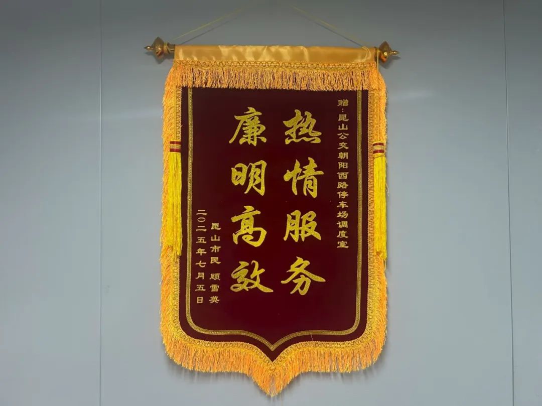7月5日中午,顾女士乘坐128路公交车时不慎把自己的包遗失在车上。顾女士拨打了公交服务热线登记信息并前往一分公司调度中心寻求帮助。顾女士到了调度中心后将事情经过详细地描述给当班调度员朱晨杰、陈姗姗,两位调度员一边安抚顾女士,一边根据顾女士提供的信息调取车载监控视频寻找失物并协助顾女士报警。当晚,顾女士成功拿回了丢失的包。7月9日,顾女士带着一面写有“热情服务,廉明高效”的锦旗到一分公司调度中心向调度员朱晨杰、陈珊珊表示感谢。