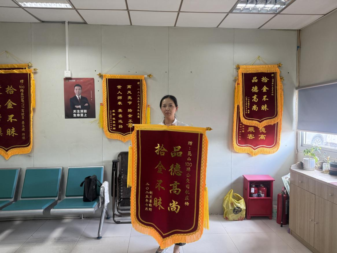 7月9日下午,胡女士乘坐100路公交车回家,下车后发现手机遗落在车厢内,她用家人的手机拨打公交服务热线求助,同时不断给自己的手机打电话。彼时,车厢内一位乘客注意到座位上有手机一直在响,便将手机交给驾驶员庄杨师傅保管。在停靠箓溪新村站台时庄师傅立马接听了电话,告知胡女士手机被妥善保管着,同时与胡女士约定时间地点领取手机。晚上,胡女士在花集路西环路站台上车取回了手机。7月25日,胡女士专程送来一面印有“拾金不昧,品德高尚”的锦旗,感谢公交100路驾驶员庄杨拾金不昧。