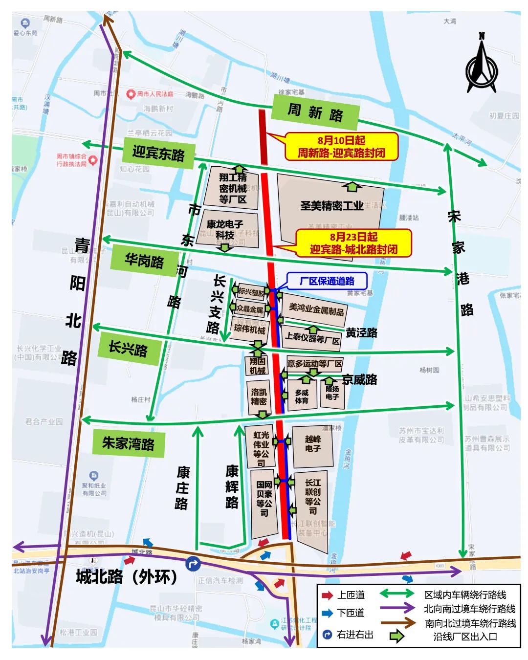 8月23日起,黄浦江北路(迎宾路-城北路)段全封闭施工,过境机动车、非机动车和行人可从周新路、青阳北路、城北路、迎宾路等周边路网绕行;沿线厂(园)区机动车、非机动车和行人可通过厂区保通道路(仅供受施工影响的厂区通行)从迎宾路、华岗路、长兴路、朱家湾路、城北路、青阳北路等周边道路绕行。