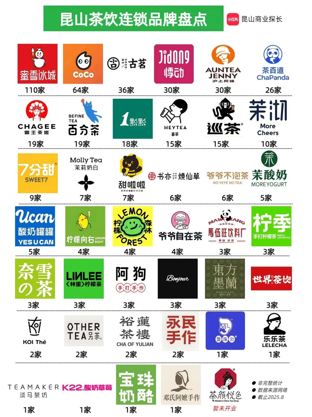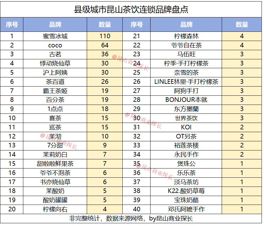 我们最新统计了40家连锁茶饮品牌在昆山的布局,一共观察到487家门店!