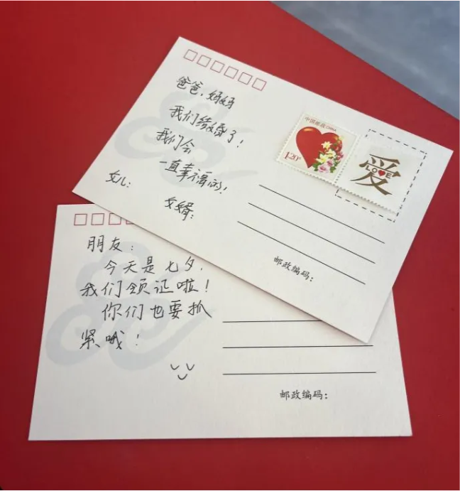 七夕当天,婚姻登记处本部的“甜蜜邮筒”静候佳音。当天在昆山领证的新人可获赠两张印着昆山风物的爱情明信片,将新婚的喜讯写给父母、挚友,让远方的牵挂也能拆阅这份稳稳的幸福。