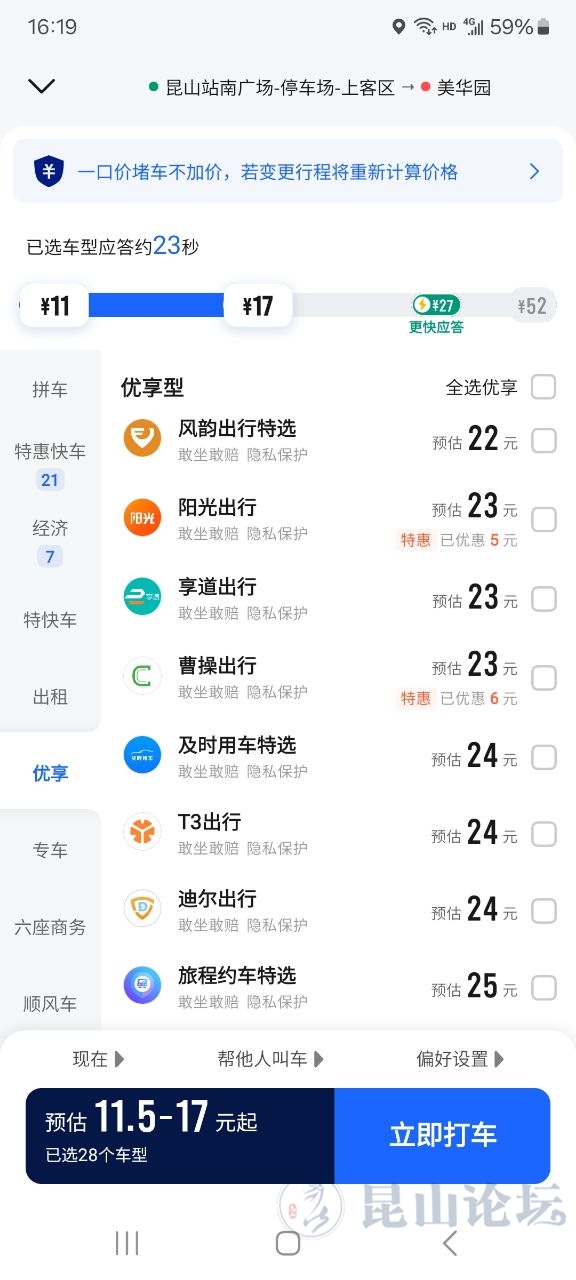 经济车17元左右。优选车24元左右,出租车也是24元左右。