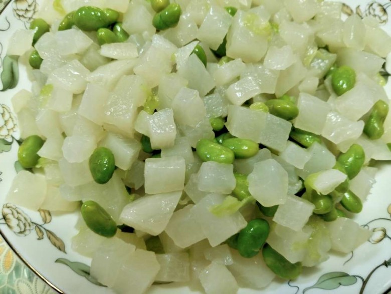 萝卜丁淖水去辛辣味,和毛豆米一同下锅翻炒,加点水,盐焖煮一会即可。