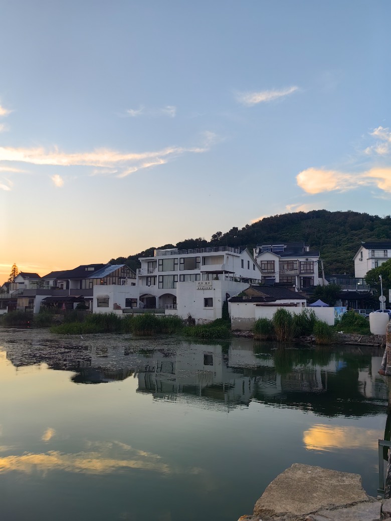 第三天中午退房后,我们开往下一个目的地,西山横山岛,这次是个民宿,世外桃源般的小村子里。老板很好,有求必应,真的适合人多一起来放松度假。横山堤坝,是个网红打卡点,看日落绝佳地,那天很多很多人在拍照。借用我哥家的自行车骑行在岛上,岛不是环岛,沿着路一直骑,最后原路返回。可见村子里徽派民居,白墙黑瓦的老房子错落有致,枇杷树与碧螺春茶田点缀其间,田园风拉满。用餐原本想去岛外的,天热大家都懒得跑,问了民宿老板,老板推荐了隔壁的小饭店,饭店虽小但是菜我们都喜欢,性价比很高。