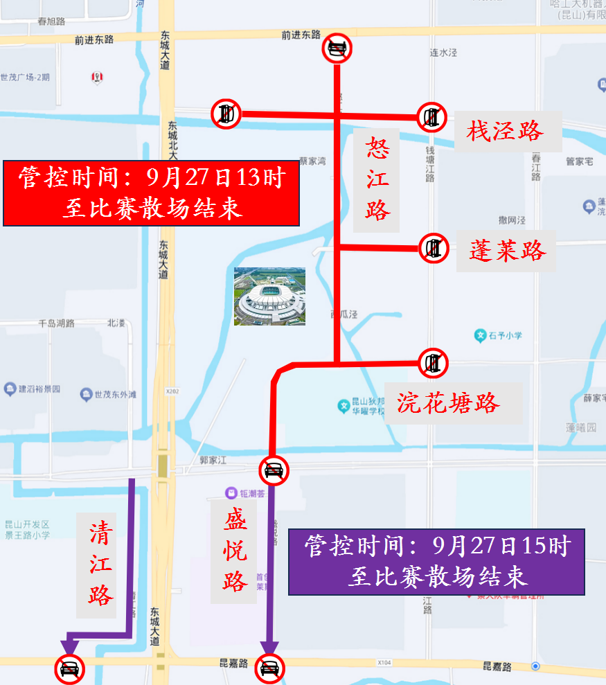 2025年江苏银行江苏省城市足球联赛(苏州赛区)第十三轮苏州对战常州的比赛将于2025年9月27日(周六)19时35分在昆山奥体中心举行,为确保赛事期间道路交通安全畅通,根据《中华人民共和国道路交通安全法》及《中华人民共和国道路交通安全法实施条例》的有关规定,决定对相关道路实施临时交通管控,除比赛保障车辆和公交车外的其他车辆限制通行。
