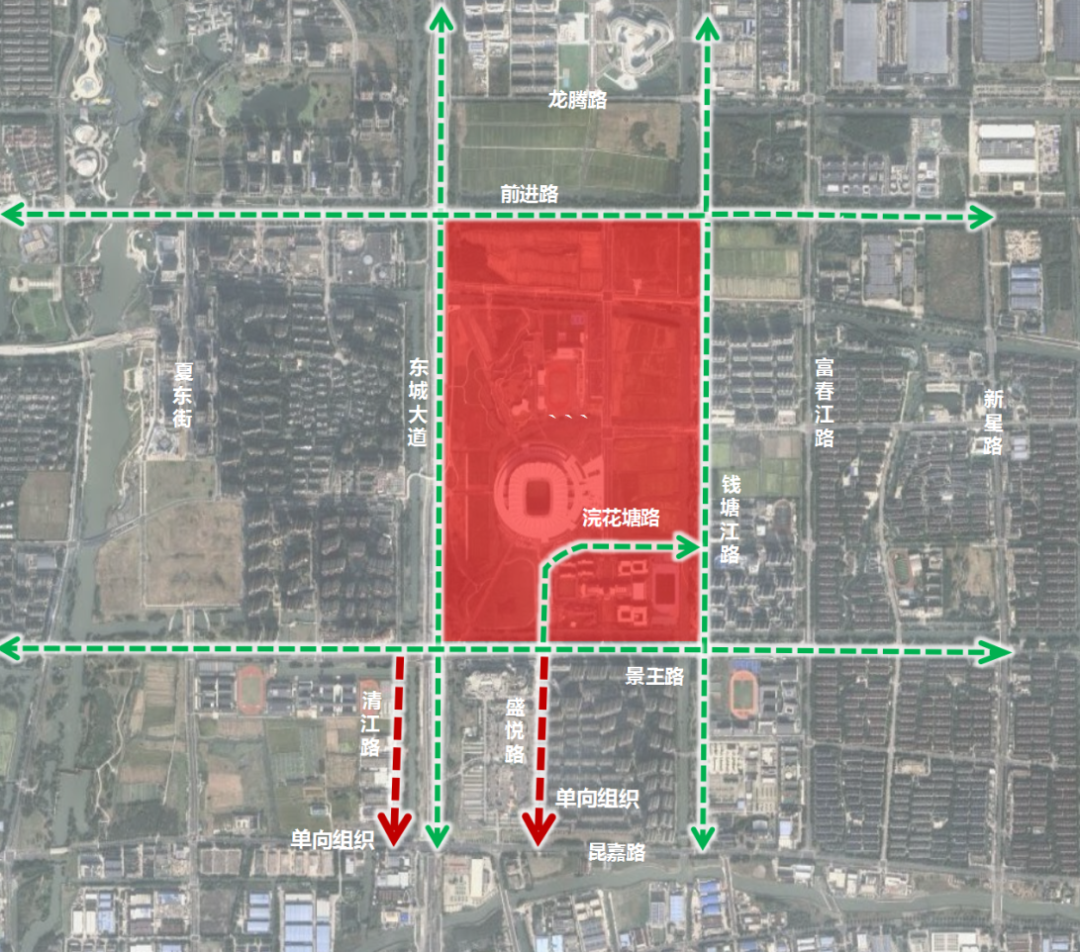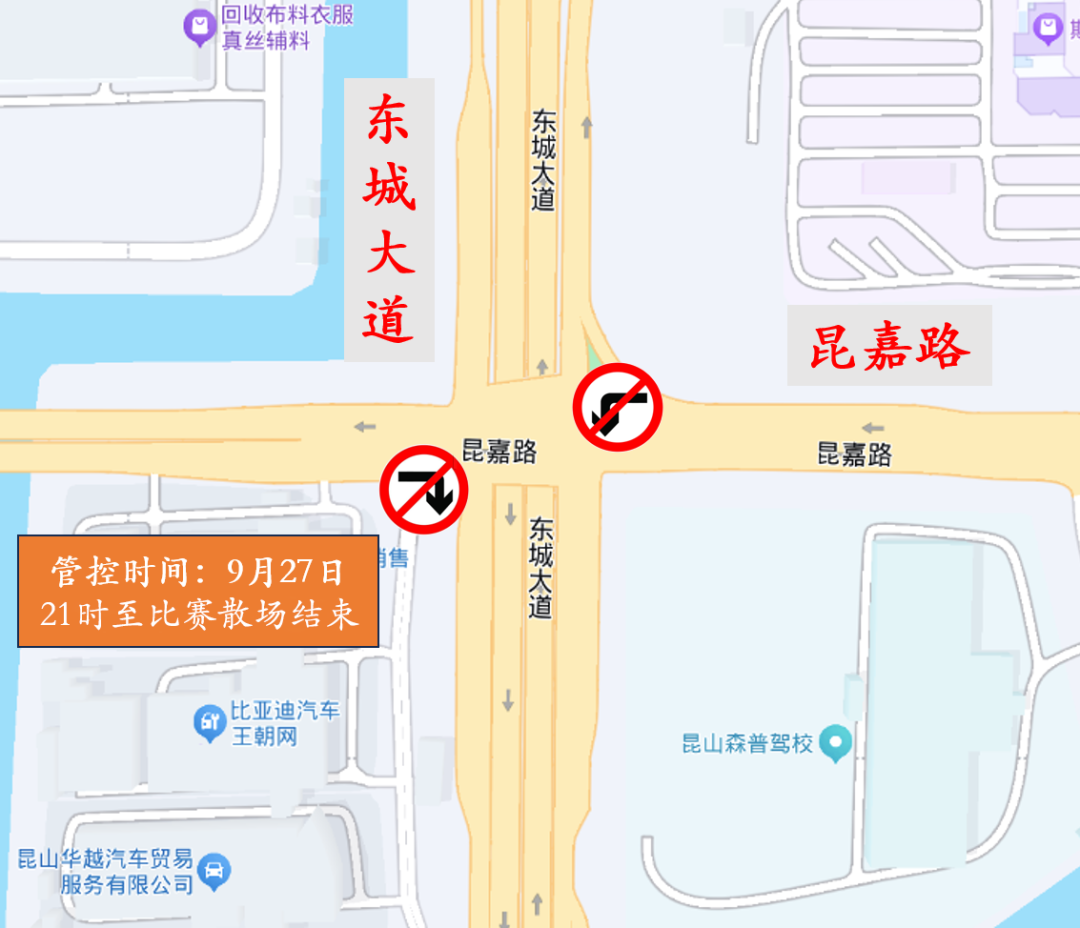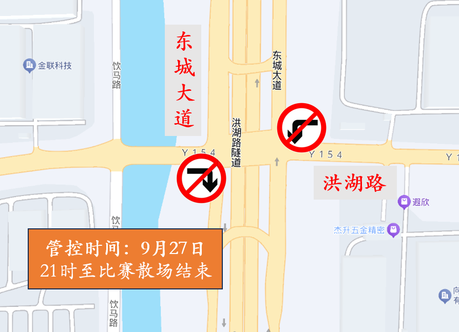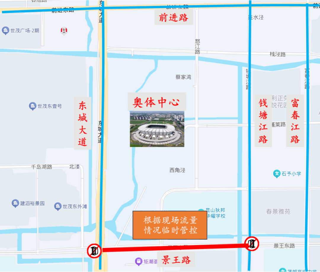 管控路口:东城大道洪湖路、东城大道昆嘉路路口临时实施交通管控,机动车请勿沿辅道向南行驶;将根据现场流量情况对景王路(东城大道-钱塘江路)临时实施路段交通管控。