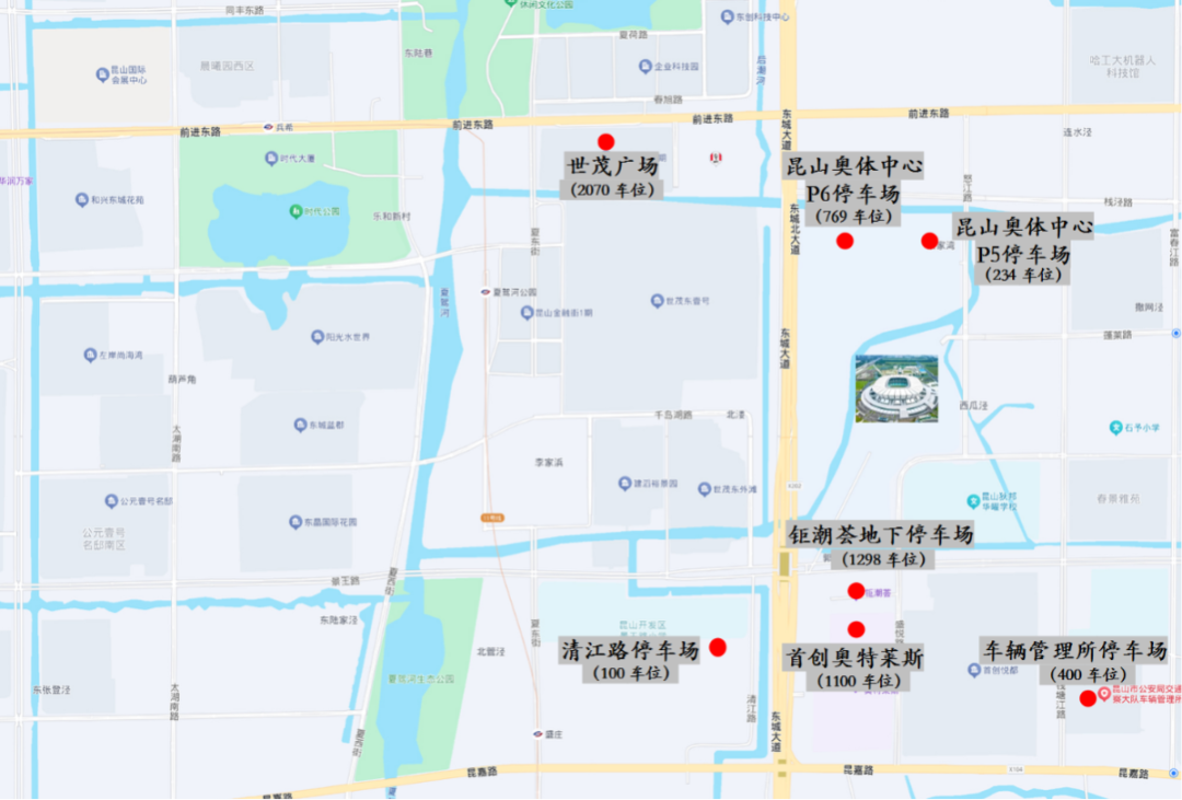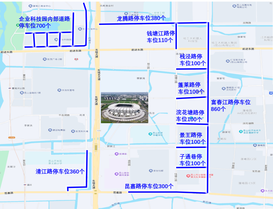 昆山奥体中心周边共有9个停车场,内设停车位约12000个,赛事当天可供观众使用的车位约为7300个。