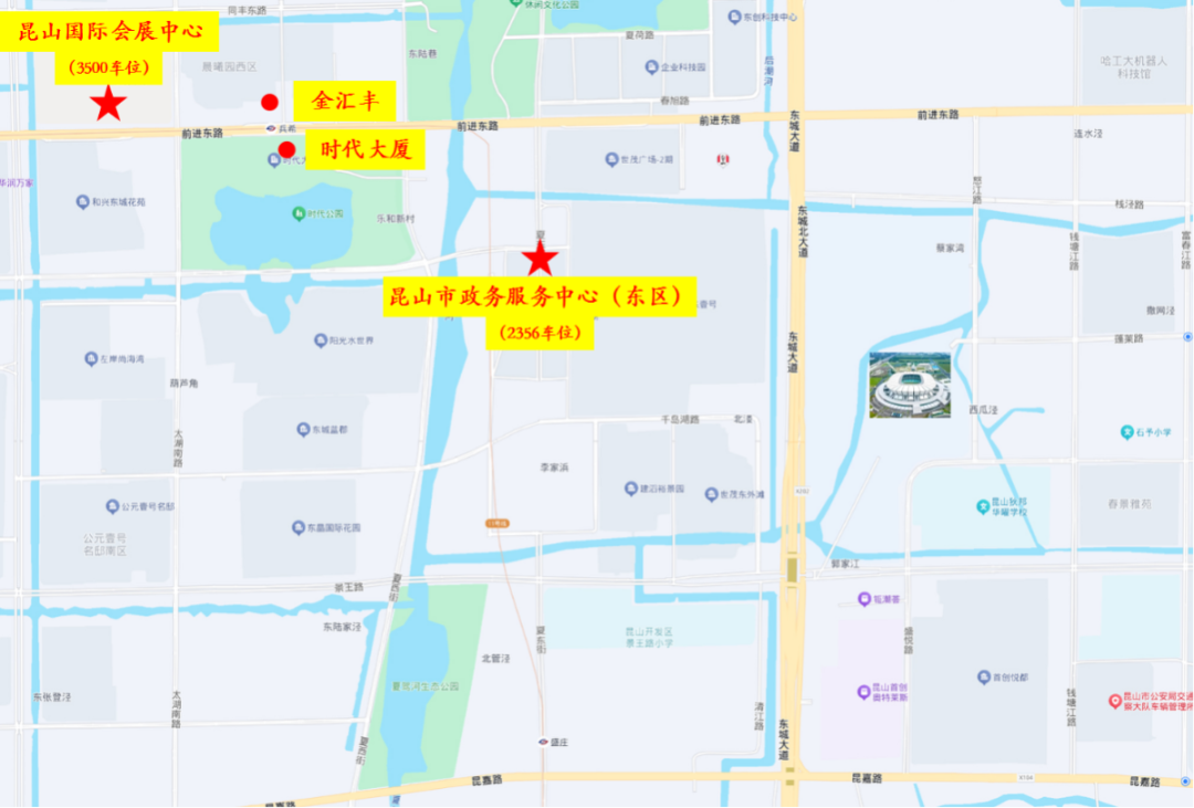 昆山国际会展中心、金汇丰、时代大厦(合计3500个车位)、昆山市政务服务中心(东区)停车场(2356个车位)【以上停车场可用停车位充裕且配套免费公交专线】。