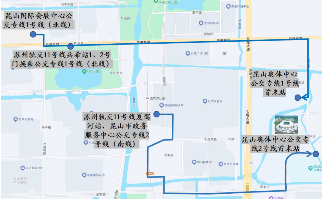 2.可乘坐苏州地铁11号线至夏驾河公园站(8号口),换乘免费公交专线2号线(南线)至奥体中心。