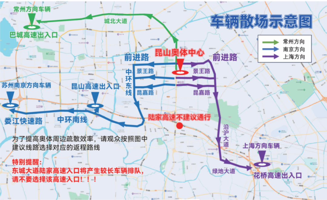 散场时,因东城大道沪宁高速陆家收费站车多缓行,需要通过高速离昆的自驾车辆,建议选择沪宁高速昆山收费站、常嘉高速巴城收费站和连接娄江快速路的昆山中环高架。