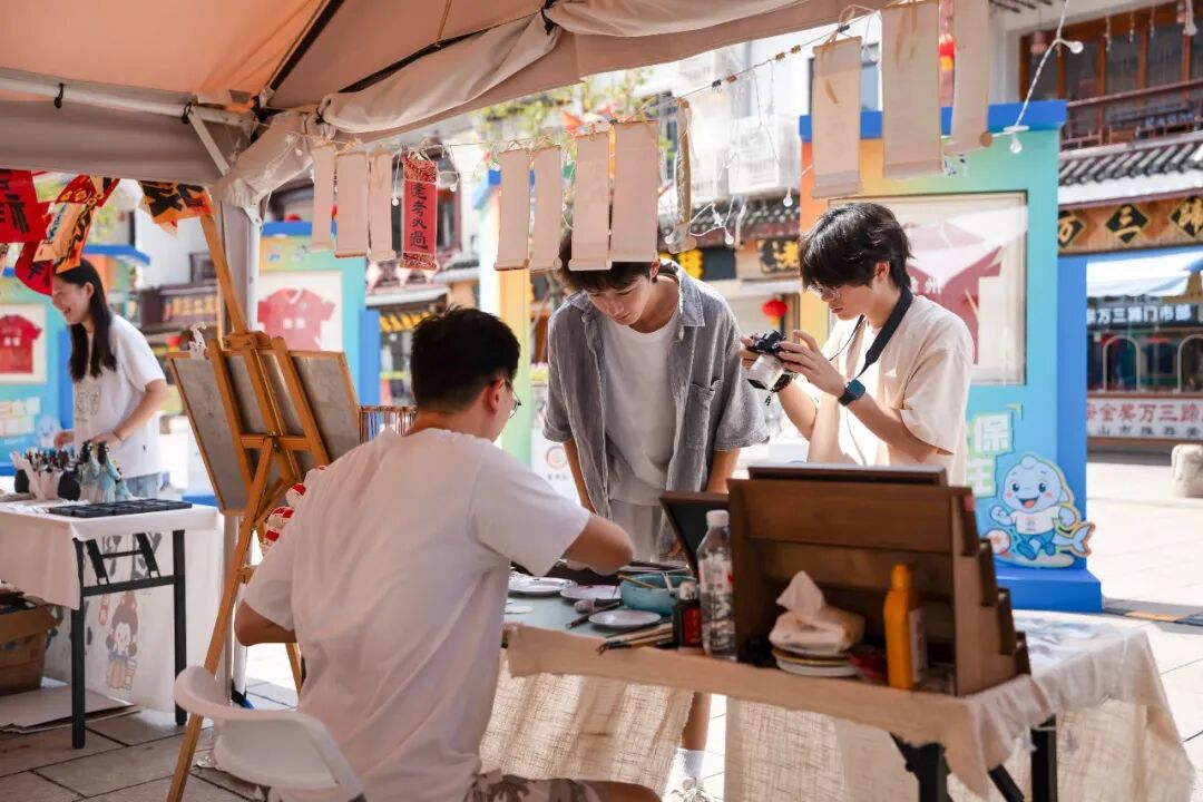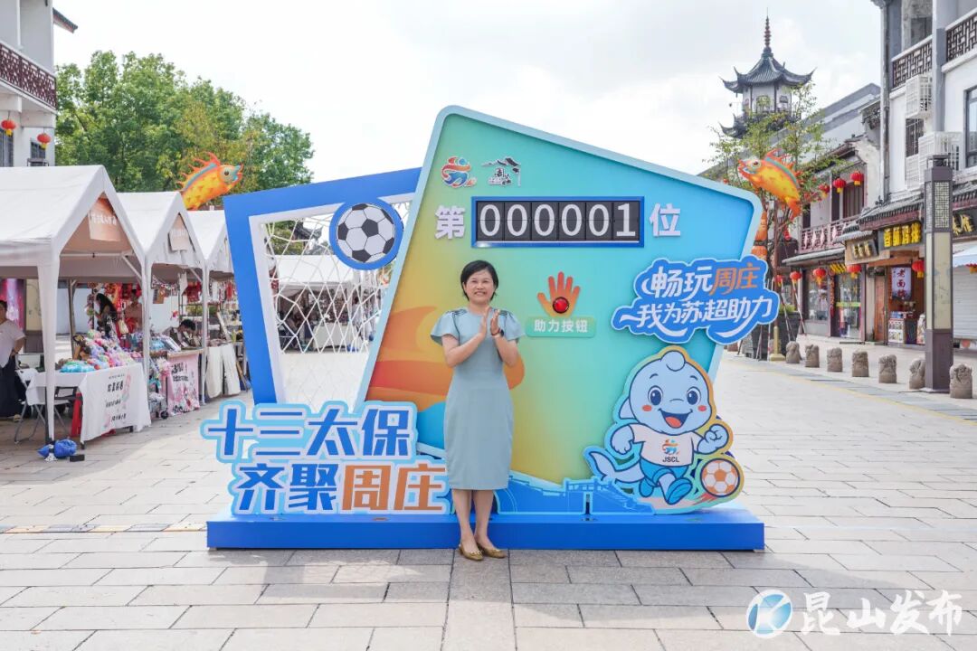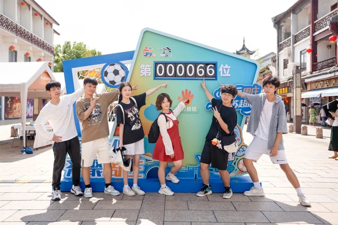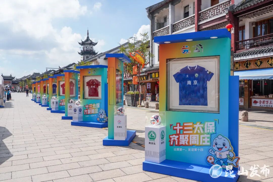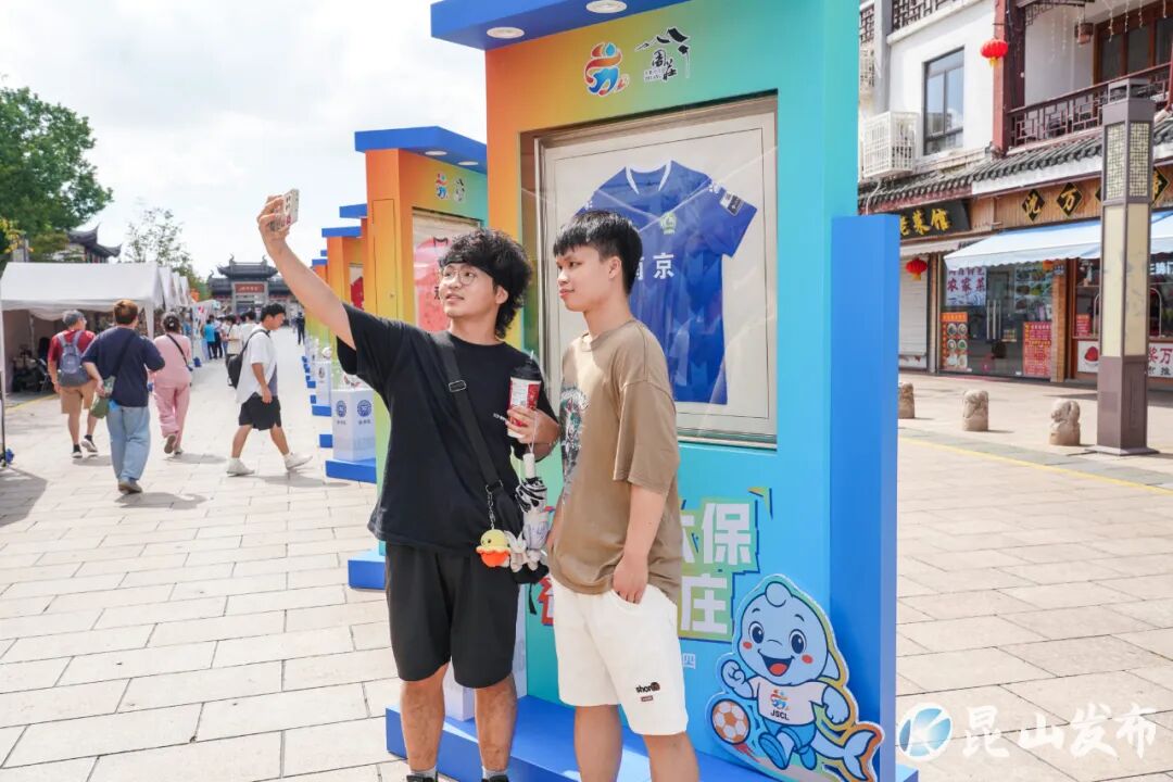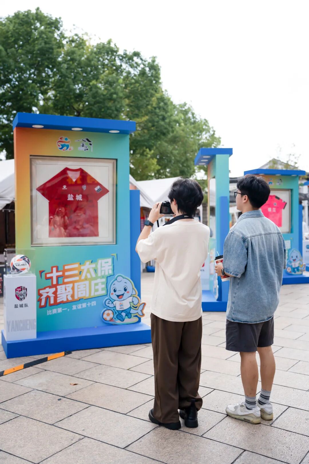 在周庄古牌楼广场限时展出、集齐“苏超”联赛13支球队签名球衣与签名足球的“我为苏超助力”打卡墙一经亮相便引爆全场,成为市民游客争相打卡的焦点。现场,“苏B是必胜的必”“胜败乃兵家常事”等趣味标语实力出圈,吸引众多球迷驻足合影。一旁的“苏超”市集汇聚文创好物与助威互动,将足球热情从绿茵场蔓延至水乡街巷。