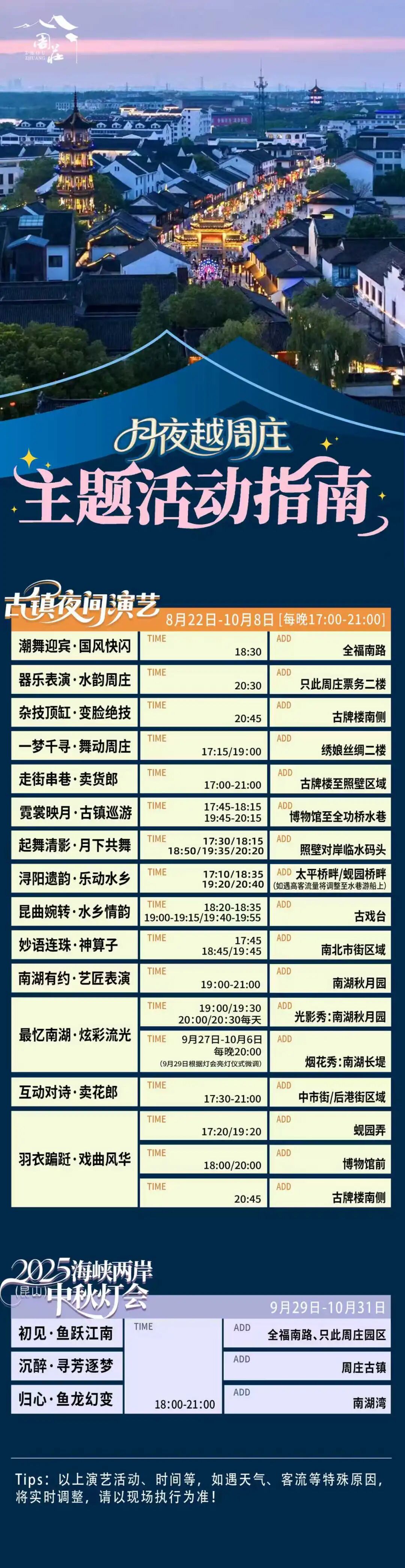 据悉,9月26日至28日期间,江苏居民凭借有效证件可免费游览周庄,并沉浸式体验“月夜越周庄”夜间演艺活动,感受国风快闪、NPC互动、南湖光影烟花秀等活动的独特魅力。同时,周庄还推出文旅消费券及主题线路推荐,全面激发夜间消费潜力。此外,结合9月29日晚即将璀璨亮相的周庄中秋灯会,水上灯景交相辉映,营造出“灯映月色水映灯”的浪漫氛围。