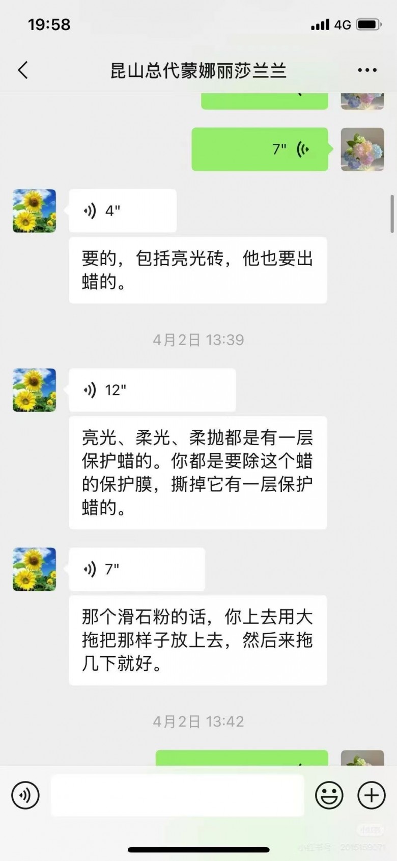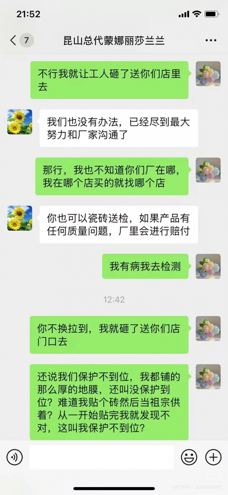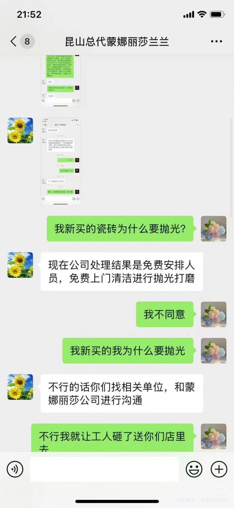 昆山星艺佳一楼蒙娜丽莎瓷砖,从我铺完我就发现瓷砖上打扫不掉,她们一直跟我说上面是一层蜡,说用腻子粉能去掉,等保洁完以后腻子粉也去不掉,去蜡水也去不掉!她们就说厂里只给我抛光,我本来就是要装柔光砖的,现在还没入住!你们要给我抛光?我肯定不同意!商家厂家都在推卸责任,说我的瓷砖没问题!我想问眼睛看到的都不算吗?瓷砖色差你们跟市场监督局说是一块石头上切下来的,颜色肯定有深有浅!我想问瓷砖是从石头上切下来的吗?每次都那句屁话你们去检测瓷砖!这件事情还没完,你等我把砖砸掉还你店里!我发小红书就举报,那我就一直发!@蒙娜丽莎瓷砖   @红星美凯龙昆山星艺佳商场