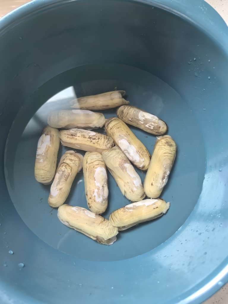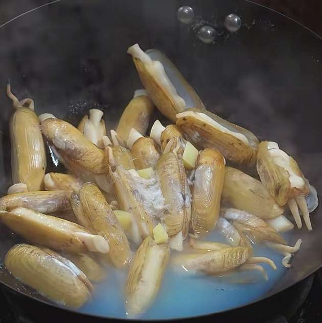 蛏子放锅里,放姜片,不要放水,直接开锅煮一分半钟,起锅,放凉可以把蛏子肉剥离!