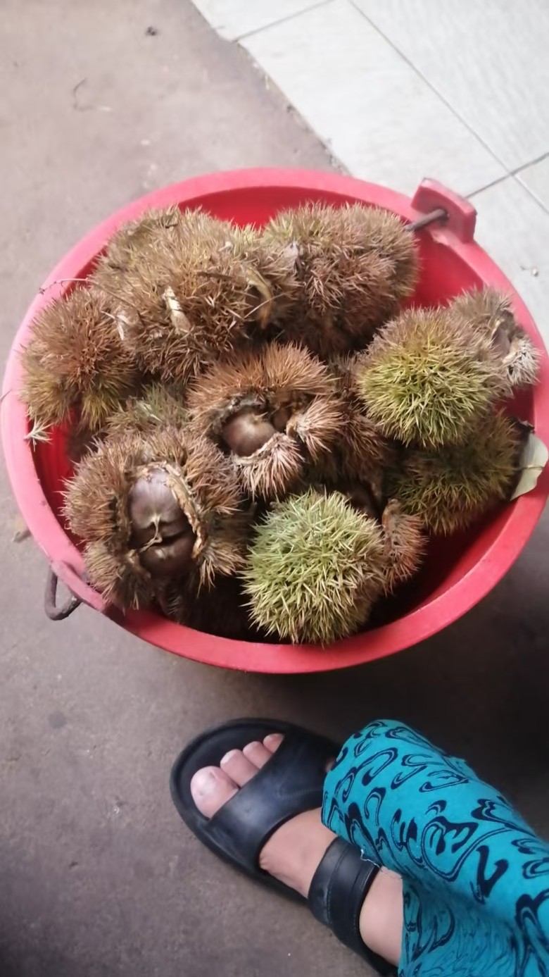 我家的辣椒苗因为种在菜地里太晒了,都不结辣椒了,邻居种在屋前的辣椒苗上结的辣椒多。[attachment=6633047]。我家门前种的板栗树,20多年了,总算比旁边的柚子树大了。当时种了两棵柚子树,左边的树被阿楠折断了,我爸爸补种了一棵板粟树。现在时不时就从树上掉几个刺球下来,我都不敢站在树下,怕中暗器。现在到处都是柚子树呀,不好吃的柚子我都不会去摘。我跟我爸爸说叫他留几个在树上,等我过年回去吃。