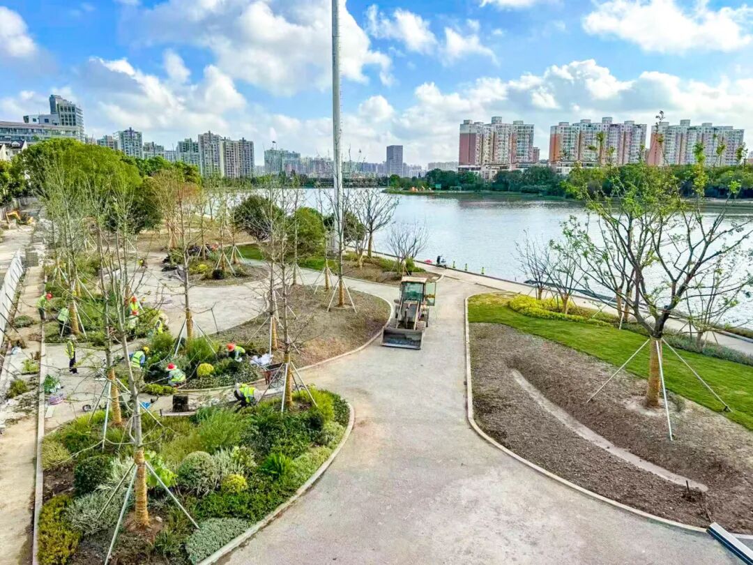 申张线青阳港段航道整治工程绿化景观工程位于昆山开发区,重点实施区域北起泊仕公寓、南至牛湾泾区域,施工内容为泊仕公寓入口步道改造、同丰路大桥场地改造以及金浦大桥场地新建。建设内容涵盖景观地形、绿化种植、景观照明等,总体绿化面积约96000平方米、硬质面积约12300平方米,其中恢复绿化面积约8800平方米、绿化乔灌木762株。