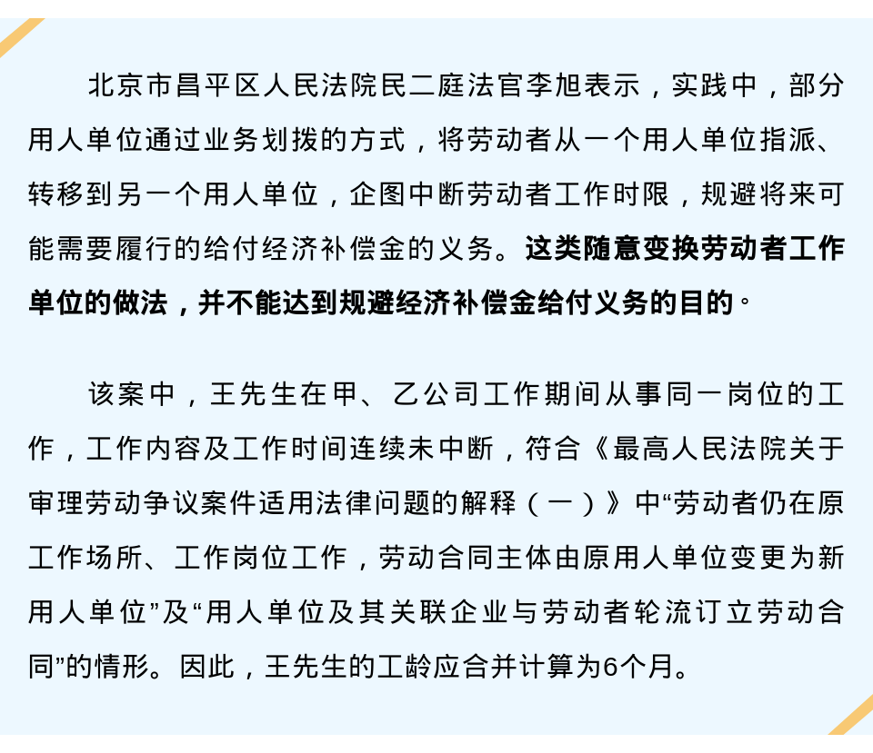 按照新疆某银行要求,刘女士与旧公司解除合同后,与新公司签订新合同,工作场所、工作岗位均未改变。但是,当刘女士因被解除劳动合同维权时,才得知其原本11年的工龄被劳动仲裁认定为仅1年。“换了一个单位,前面10年白干了?”刘女士不服,诉至法院。