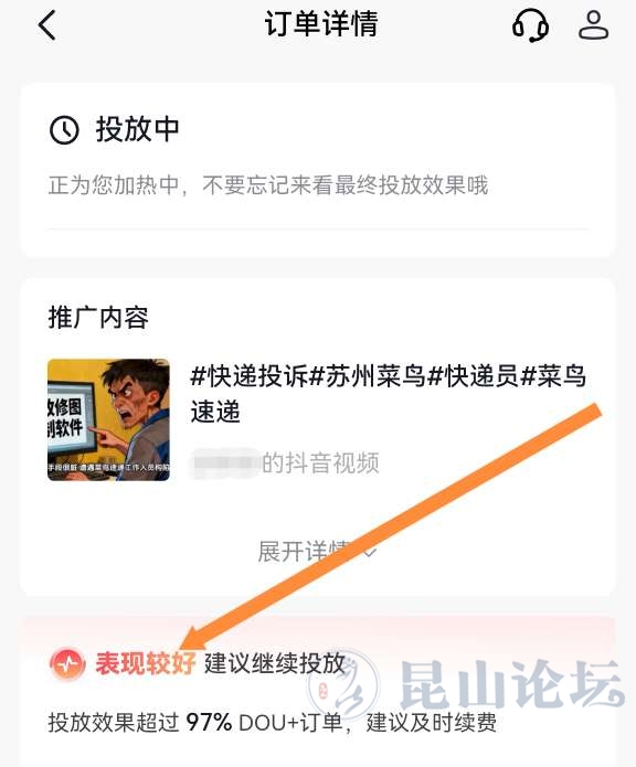 ,按照事实剪辑了一个视频,放在抖音上,反响不错,按照某网友留言“快递公司虚构证据是红线”,半天内浏览量接近 5000,我接着加了一把火,买了一个小 Dou+推抖音热点,评价:表现较好,投放效果超过 97% 的 Dou+订单。