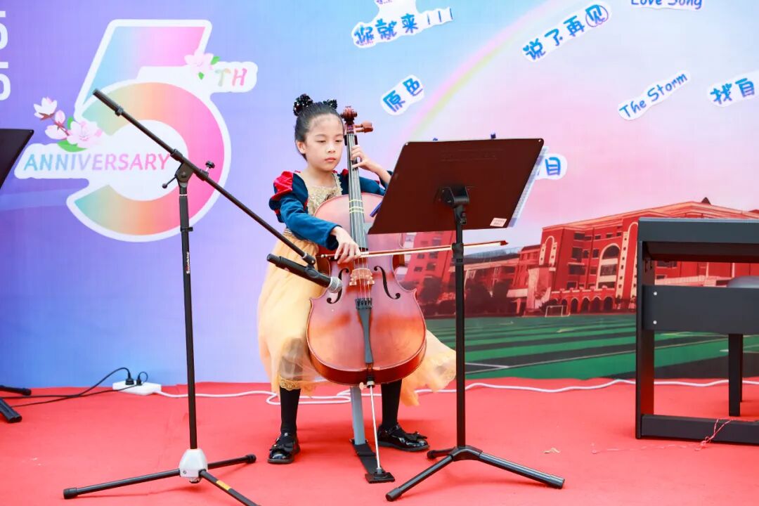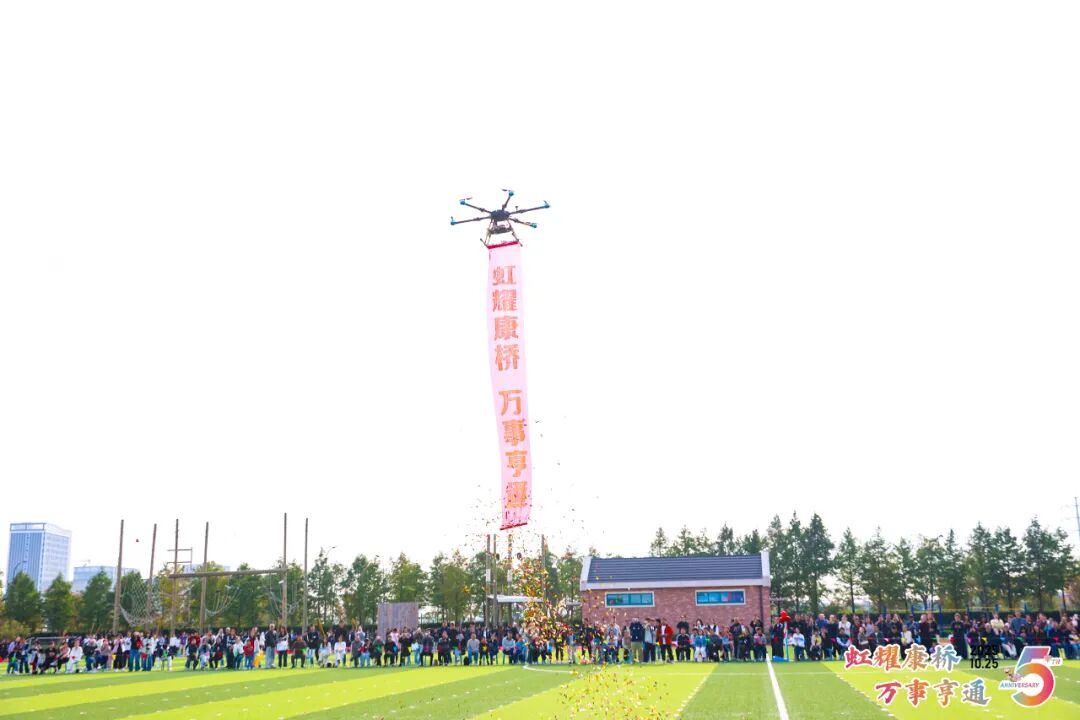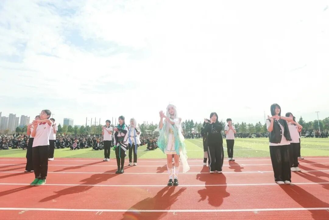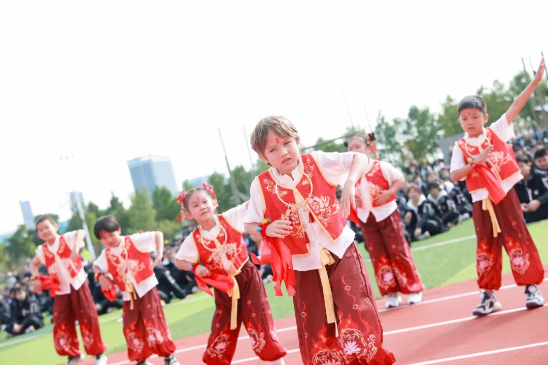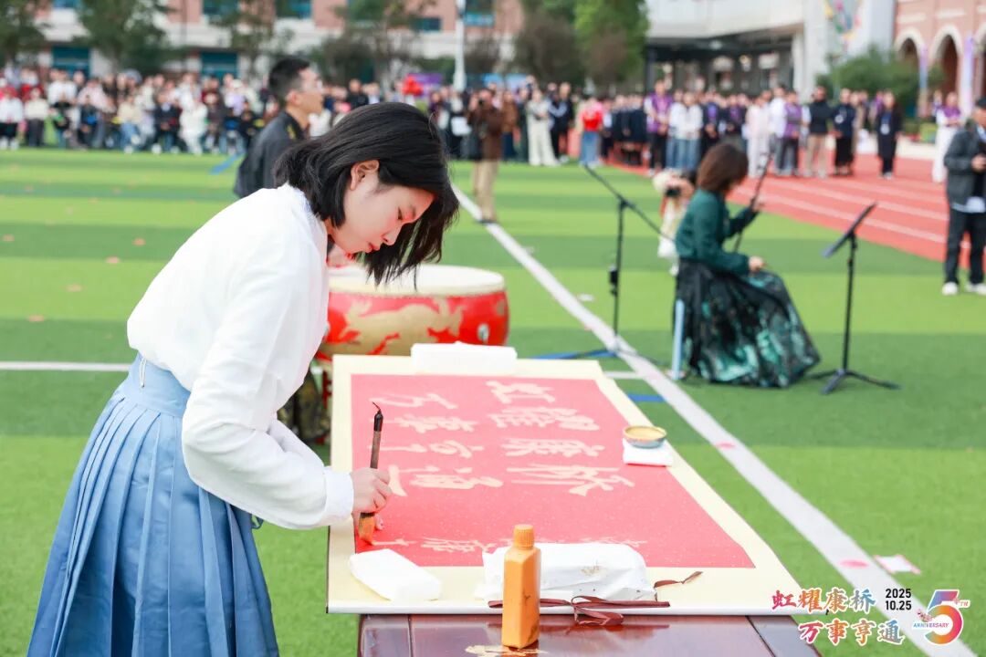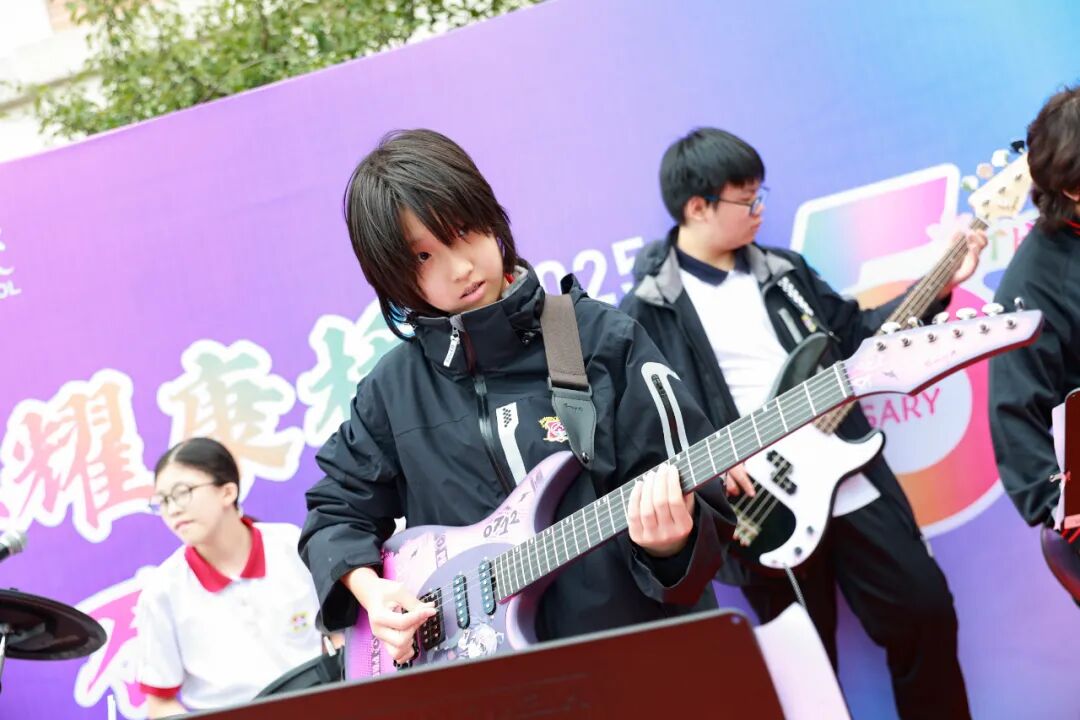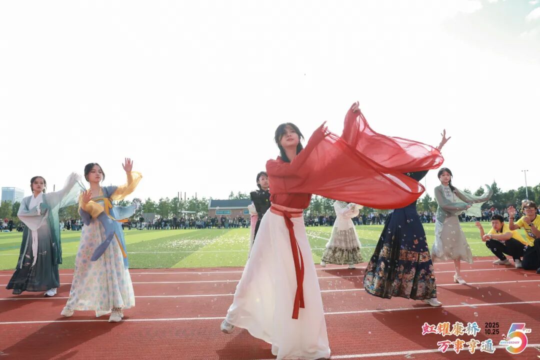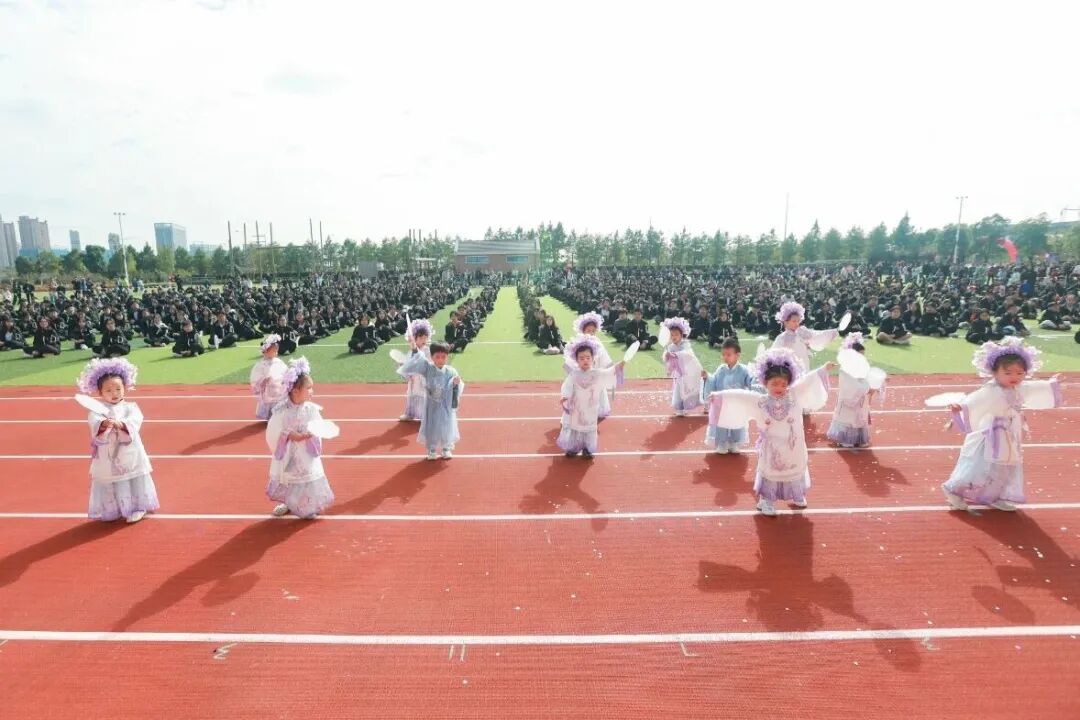 各学部学子用一场才艺展演点亮庆典序幕。高中部民乐合奏《盛世国乐》,将传统乐器与书法艺术完美融合,气韵恢弘,奏响盛世华章;初中部舞蹈串烧《Tell Me》洋溢青春活力,舞动时代风采;小学部合唱《看得最远的地方》清澈空灵,唱出美好憧憬。终场时分,无人机凌空起舞,垂落美好祝福,将活动氛围推向高潮。