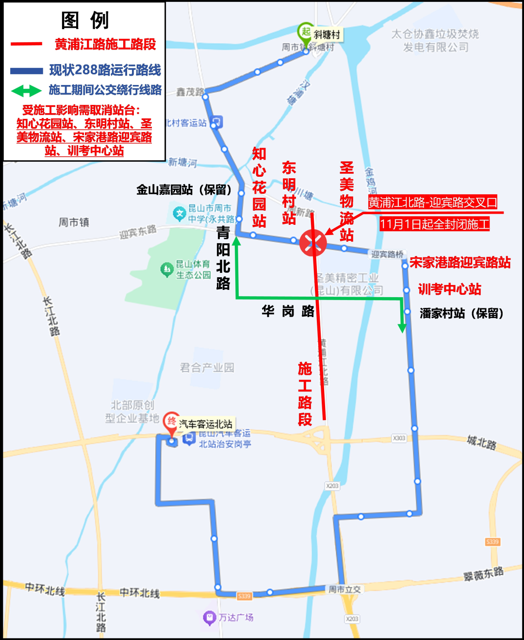 ③ 11月1日起,黄浦江北路-迎宾路交叉口全封闭施工期间,取消公交线路288路(汽车客运北站往返斜塘村)知心花园站台、东明村站台、圣美物流公交站台、宋家港路迎宾路站台、训考中心站台,线路临时调整至华岗路-青阳路绕行。