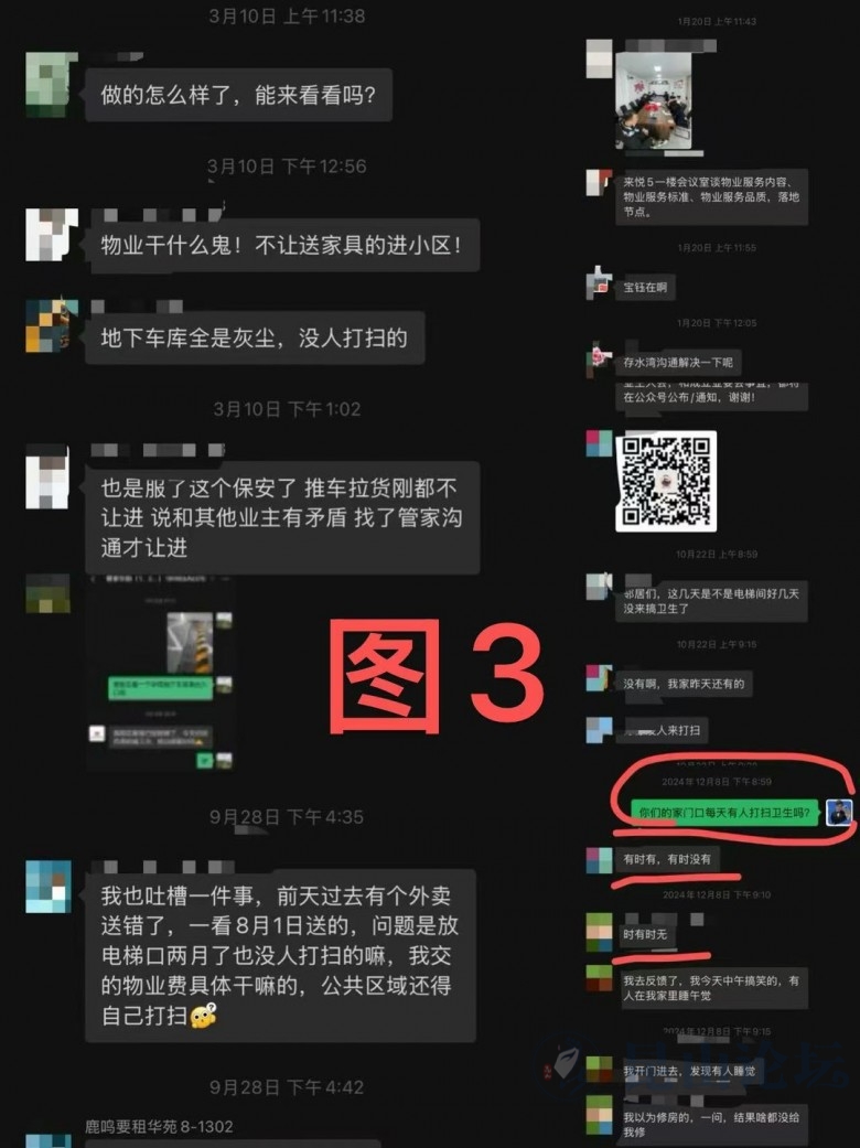 我来说说一些发生在我自己身上的事,在刚交房的时候我们开发商给了手拧礼炮,当时的仪式感还是很足的,拿钥匙的环节总体还是很满意很开心的,当时进门以后手拧礼炮的彩带飘到了公共区域,当时我没在意,因为我住的小区物业是一天2-3次的打扫,我想着会马上打扫干净,结果过了几天我过去的时候发现还在,并且楼道内一层灰,我当时很震惊,3.7/平的物业费居然没有人打扫公共区域卫生,我安慰自己我以为只是刚开始交房人员配备不齐全,我当天故意在门口撕了点纸屑,结果过了一个星期来还是没有人打扫当,后来我在群里还和大家讨论过这个事(见图3)发现物业有问题额业主不止我一个,后面有一些业主约了物业经理讨论一下小区的物业标准,并在当天告诉物业经理给他半年时间整改,如果还是像现在一样那就别怪我们成立业委会罢免物业了(搞笑的是当天讨论完物业经理被保洁大叔指着鼻子骂,并说几个月没发工资了你凭什么要我干这个干那个),后面我提出小区没有配备最基础的防汛沙箱,灭蚊灯,地库除湿机(见图4),经过7个月以后,灭蚊灯和除湿机才总算安排上,安是安了,但是安装的东西让人哭笑不得,3.7/平物业费我从没觉得贵,但是物业这样糊弄我就觉得把我当白痴了,如果哪位朋友想吃瓜欢迎来到实地考察(见图5),以上物业不作为的证据太多太多了, 现在是2025年了大家都习惯用手机水印相机记录问题,所有的问题都被记录了,以上不便透露太多是因为我分组要在成立业委会后罢免物业时对薄公堂时使用的,感谢理解。