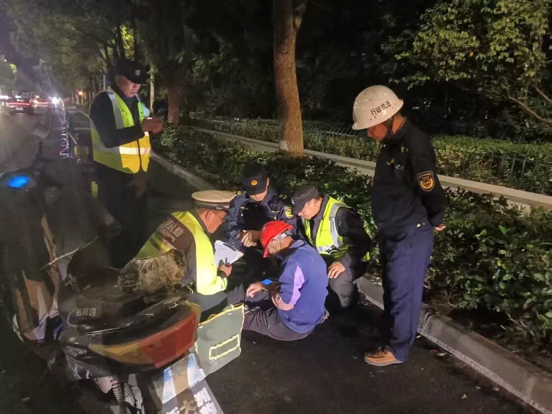 华灯初上,玉湖中队的队员们如往常一样开展夜间巡查。突然,一声巨响引起了他们的注意,只见一名佩戴头盔的男子驾驶电瓶车撞向路边护栏,连人带车重重摔倒在地,电瓶车侧翻一旁,男子面色痛苦、难以起身。考虑到夜间视线差、车速快,队员们迅速在事故现场设置警示标志,提醒过往车辆避让。他们细心检查伤者情况,倾身安抚情绪,并第一时间联系交警部门。待交警抵达现场、完成情况交接后,才放心继续投入到夜间巡查工作中。无数个这样的夜里,路面的执法队员是居民安心的“夜航灯”。