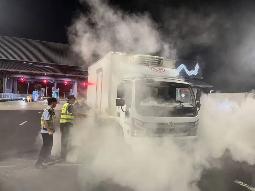 深夜22时24分,高新区G1521吴淞江高速卡口出口处上演了惊心动魄的一幕,一辆冷链货车车头突然冒起浓烟,火势蔓延。正在执行“夜鹰行动”的柏庐中队队员发现险情后,立即启动应急预案。队员们临危不乱,一边疏散现场车辆,一边迅速取来灭火器冲向起火点,浓烟中,他们顶着高温对准火源进行扑救。在明火被扑灭又复燃的危急时刻,队员们沉着应对,经过三分钟紧张扑救,终将火势彻底控制。执法队员以果断专业的处置,保住了车辆和货物,守护了司机的生命安全,践行了“人民至上、生命至上”的庄严承诺。
