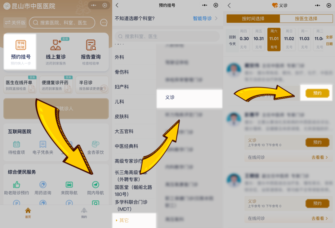 1. 预约义诊号:至昆山市中医医院微信公众号选择“义诊”预约义诊号(免挂号费)