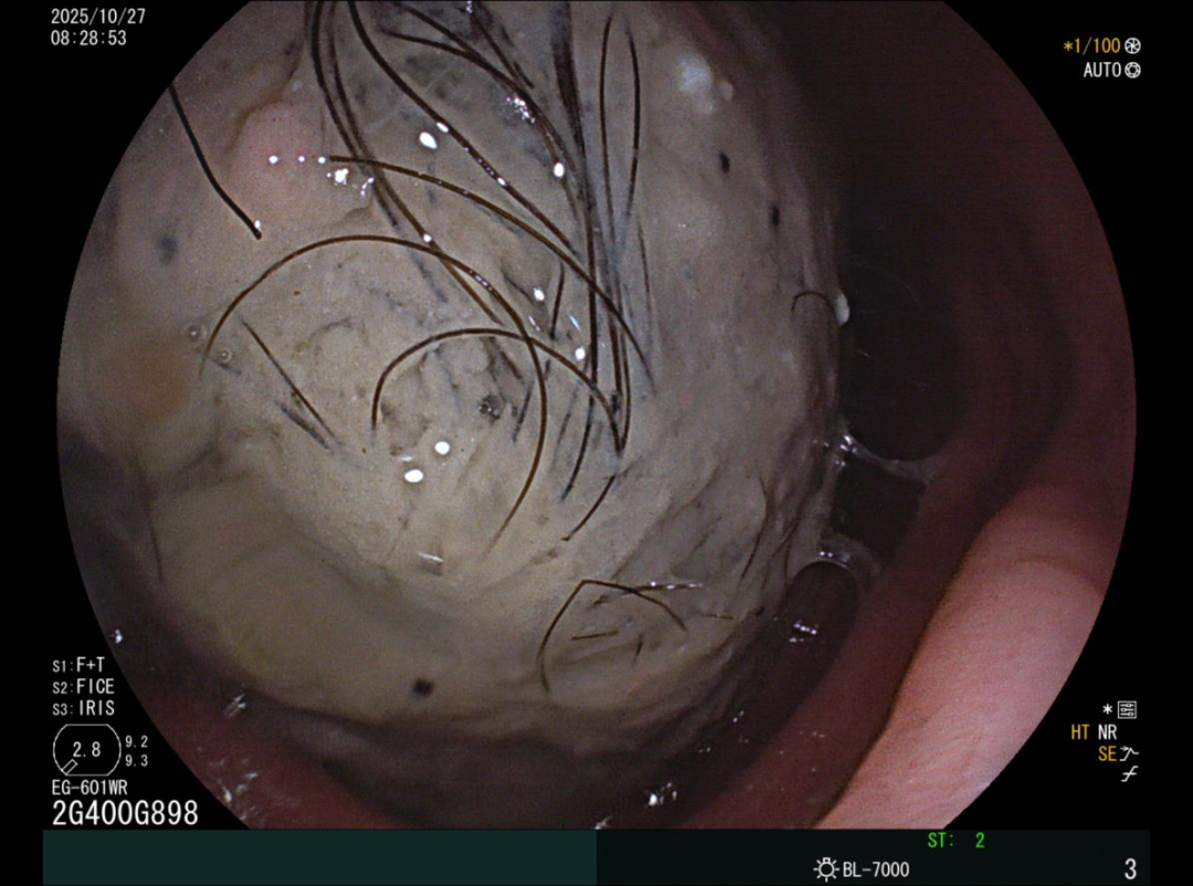 而胃镜检查的结果让在场医护人员深感意外——小李的胃腔几乎被一团缠绕成团的毛发完全占据,毛发与食物残渣牢牢纠缠,形成了巨大的“毛发结石”,如同一只被困在胃中的“黑色野兽”。