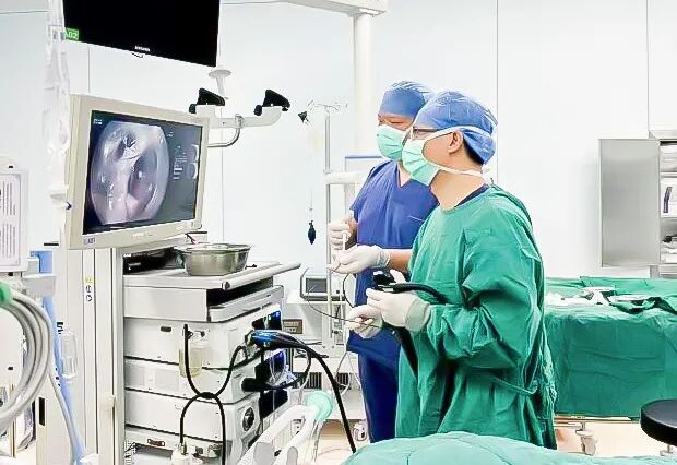 ▲许邹华主任中医师及陶鸣浩副主任中医师两次分别在手术室及内镜中心为小李手术。