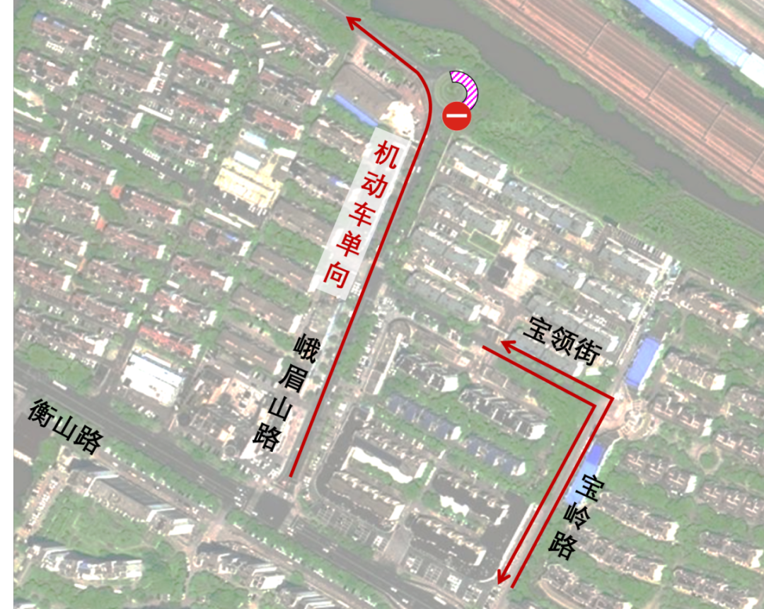 宝领家园至峨眉山路段全封闭施工,峨眉山路与宝领街交叉口北侧机动车道占道5米宽封闭施工,西侧9米宽保证机动车和非机动车双向通行。