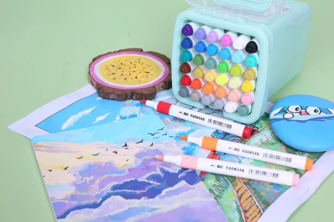 该款马克笔分24色、36色、48色三种规格,笔杆采用了三角形设计,三个面便于儿童手部三指握持,颜料中使用的丙烯酸酯具有较高活性,可溶解于水中,使用过程中如果不慎弄脏衣物,哪怕颜料已在衣物上干透,只需用水轻轻擦拭就可洗涤干净。