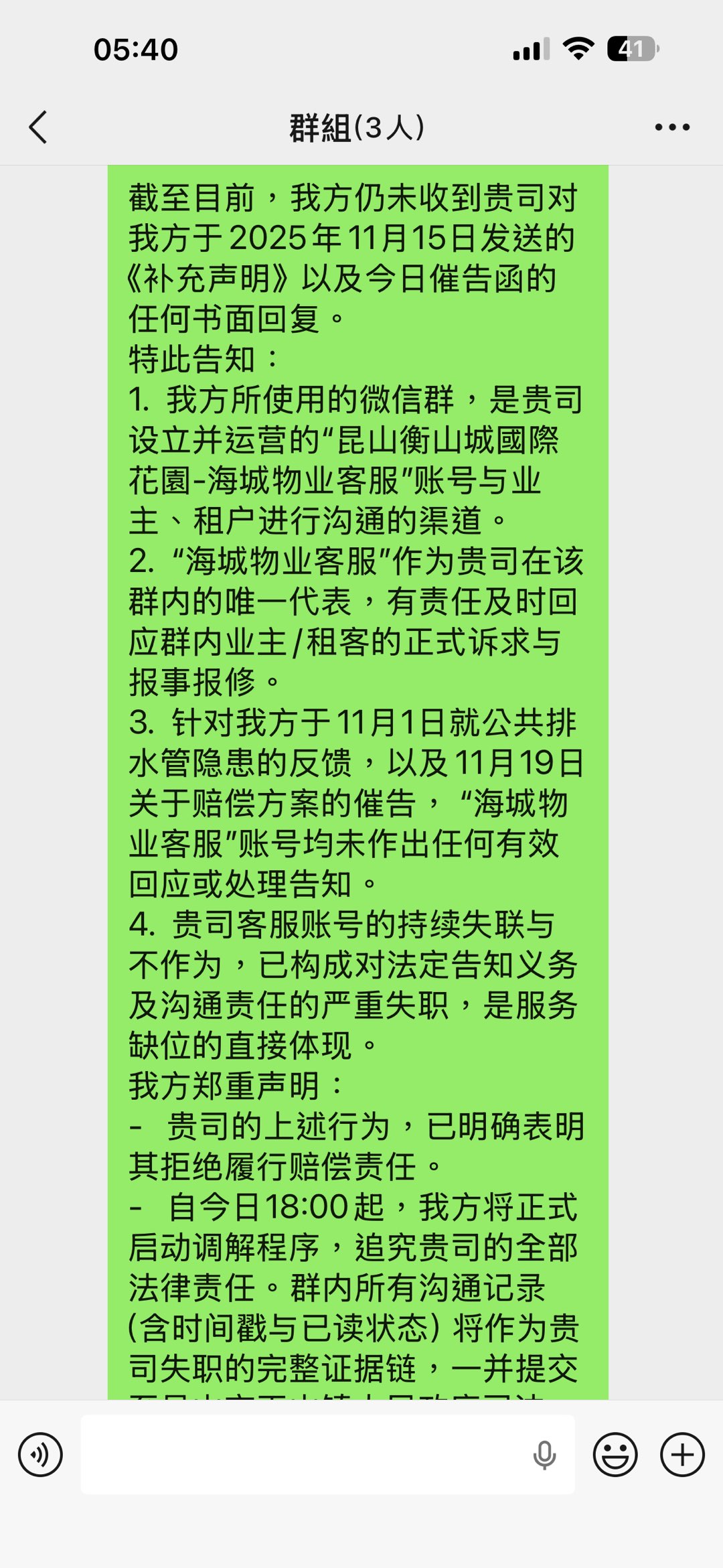 更气人的是,海誠物业在10月11号就来抽水了,但根本没告诉我“清理积水会毁灭证据”,也没拍照留底,直接把现场清理得干干净净。等我回来找他们,他们就推说“不是我们的责任”,还说“你没及时报修”。