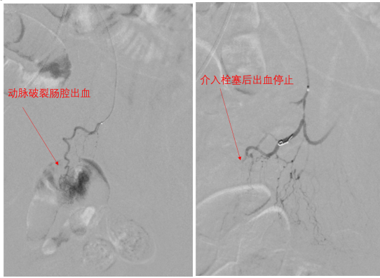 术后造影确认,原先造影剂外溢的出血点完全消失,被成功封堵;而周围的正常肠管血管网络显影良好,提示血供正常。