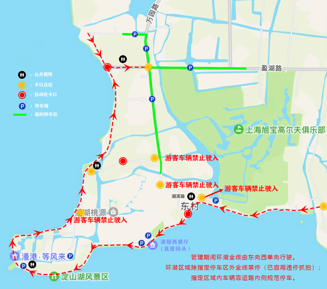 3.环湖大道东村入口、万园路湖滨路路口、万园路望金路路口放行管理区域内居民,游客车辆禁止驶入(环湖大道东村入口及万园路湖滨路路口放行东村村民及东淀湖庄园居民;万园路望金路路口放行南巷、西南巷村民及淀湖桃源居民)。