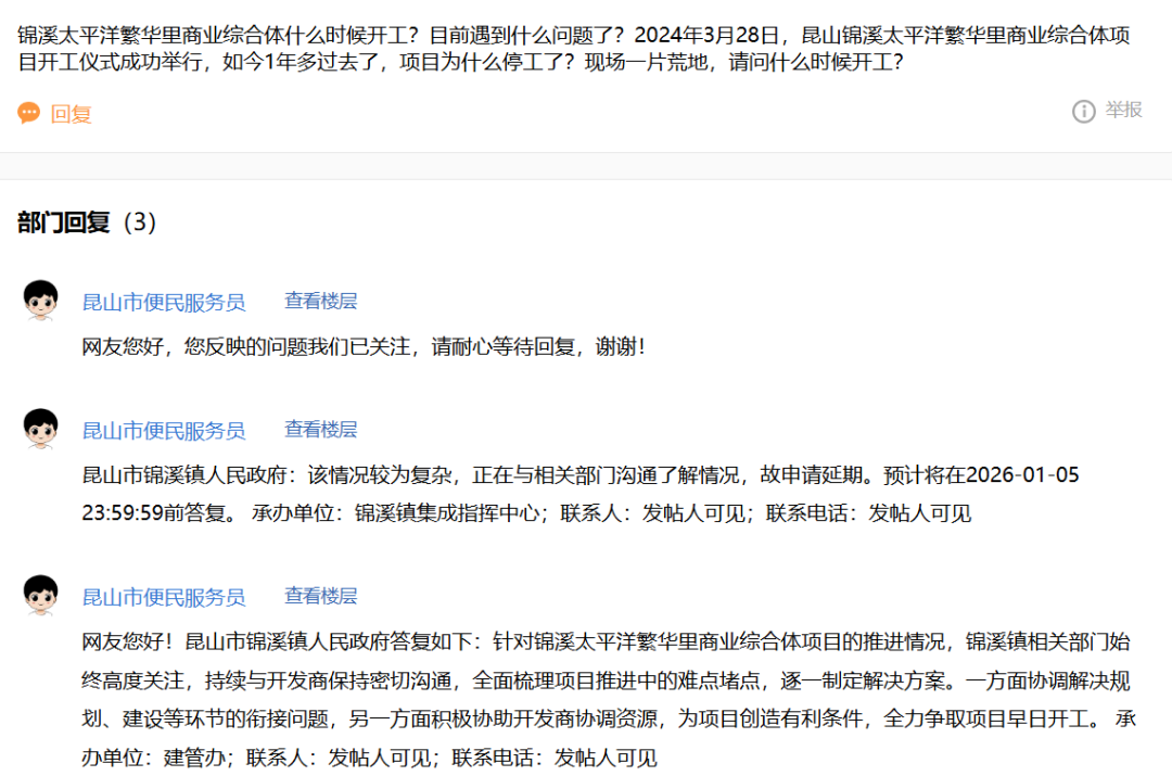 有网友在寒山闻钟论坛发帖询问锦溪太平洋繁华里项目进度,昆山市锦溪镇人民政府作出了如下回应:政府相关部门“始终高度关注”,正与开发商密切沟通,梳理难点堵点,协调规划、建设环节,并协助开发商协调资源,目标是“全力争取项目早日开工”。这份答复确认了项目推进陷入停滞的事实,也表明了官方的介入姿态。