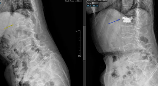 术前术后影像学检查对比显示:椎体高度完美恢复,骨水泥填充满意!