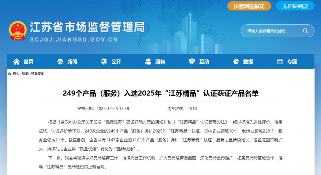“江苏精品”认证是江苏省推动品牌建设与高质量发展的核心工程,以“国内领先、国际一流”为目标,旨在围绕全省优势产业和特色产品,培育一批符合高标准、高质量要求的品牌产品与服务。认证过程涵盖标准先进性评价、信用征询、认证评价等多重严格环节,致力于将企业的“质量优势”转化为“品牌优势”。