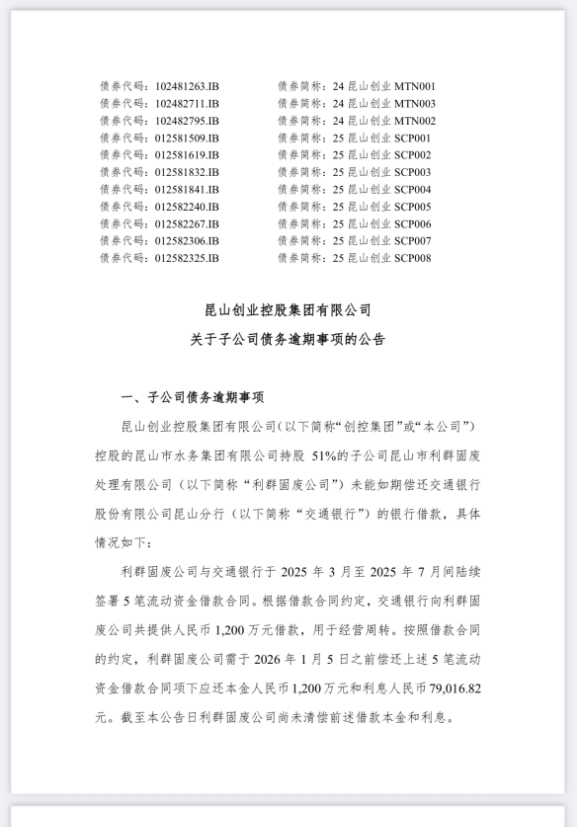 1月12日,昆山创业控股集团有限公司(以下简称“昆山创控”)公告称,其控股公司昆山市水务集团有限公司的子公司昆山市利群固废处理有限公司(以下简称“利群固废”)未能如期偿还交通银行昆山分行的1200万元借款及7.902万元利息。