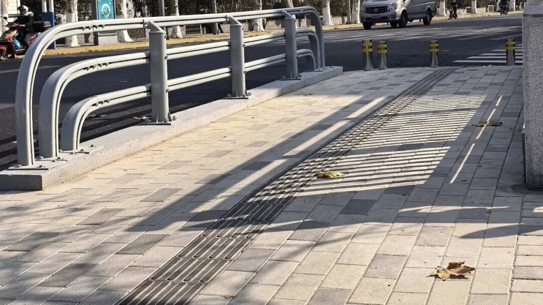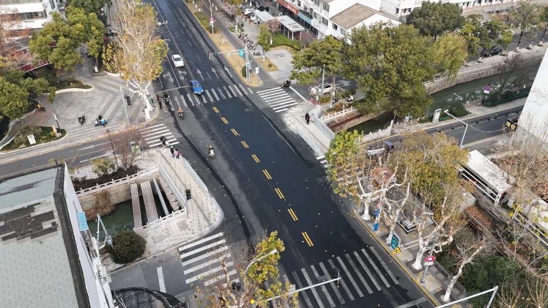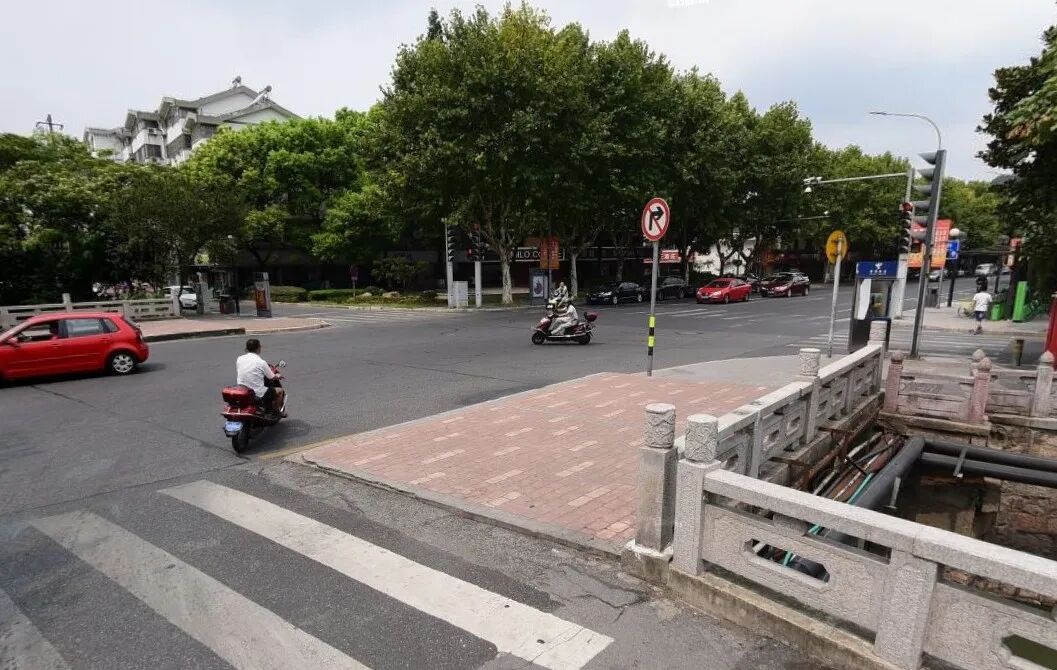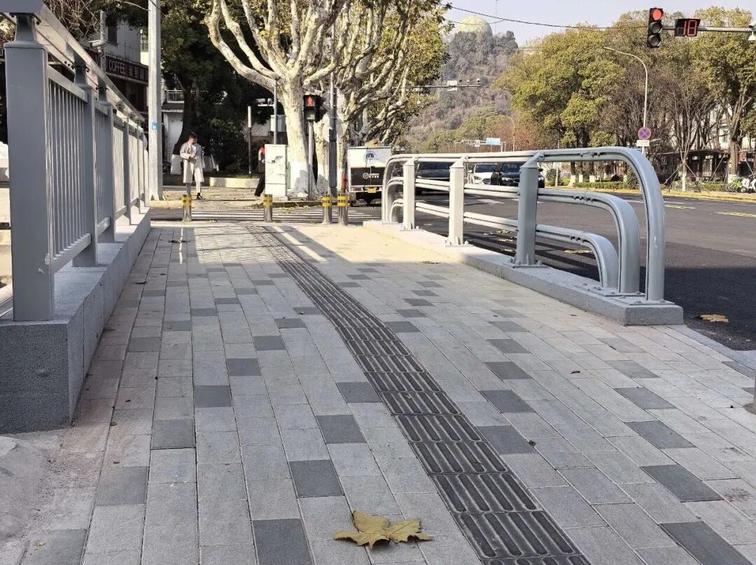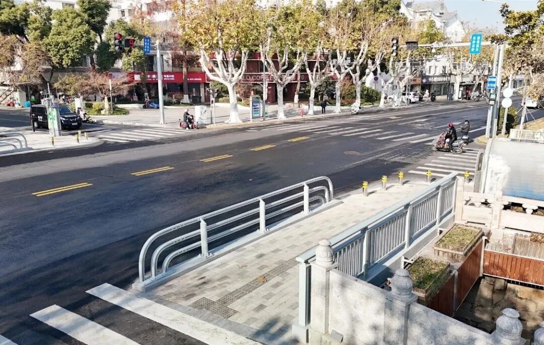通过重新规划桥面道路线型,适度压缩部分人行道,新增一条行车道,使桥面与南北两侧行车道衔接更顺畅。在人行道全线重新铺设路面砖,并完善盲道、缘石坡道等无障碍设施、加装隔离护栏,实现人车分流。改造后,车辆过桥更加流畅,早晚高峰拥堵明显缓解,行人通行平稳安全,视野也更开阔。