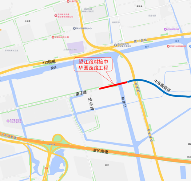 望江路对接中华园西路由园区市政建设管理中心建设,中新集团代建。项目位于胜浦街道,西起泾东路,东至昆山界,跨越界浦河后与昆山中华园路对接,全长约520米,双向四车道规模,包含新建一座跨界浦河大桥。
