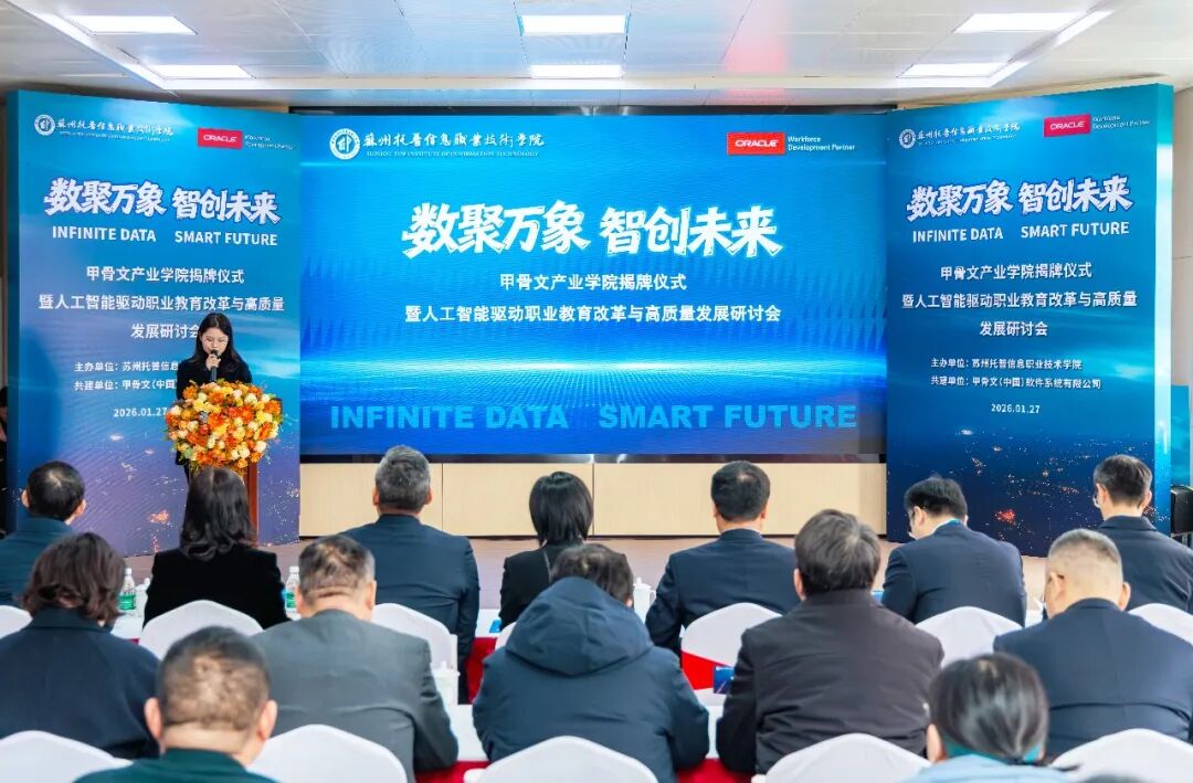 1月27日,“甲骨文产业学院”揭牌仪式暨“人工智能驱动职业教育改革”研讨会在苏州托普信息职业技术学院成功举办,一场关于人工智能与职业教育深度对话的“思想实验”正悄然发生。这里的主角是屏幕上跳动的代码、实训工位前专注的年轻面孔,以及来自全国超过50家科技企业与院校的观察者、参与者和共建者。