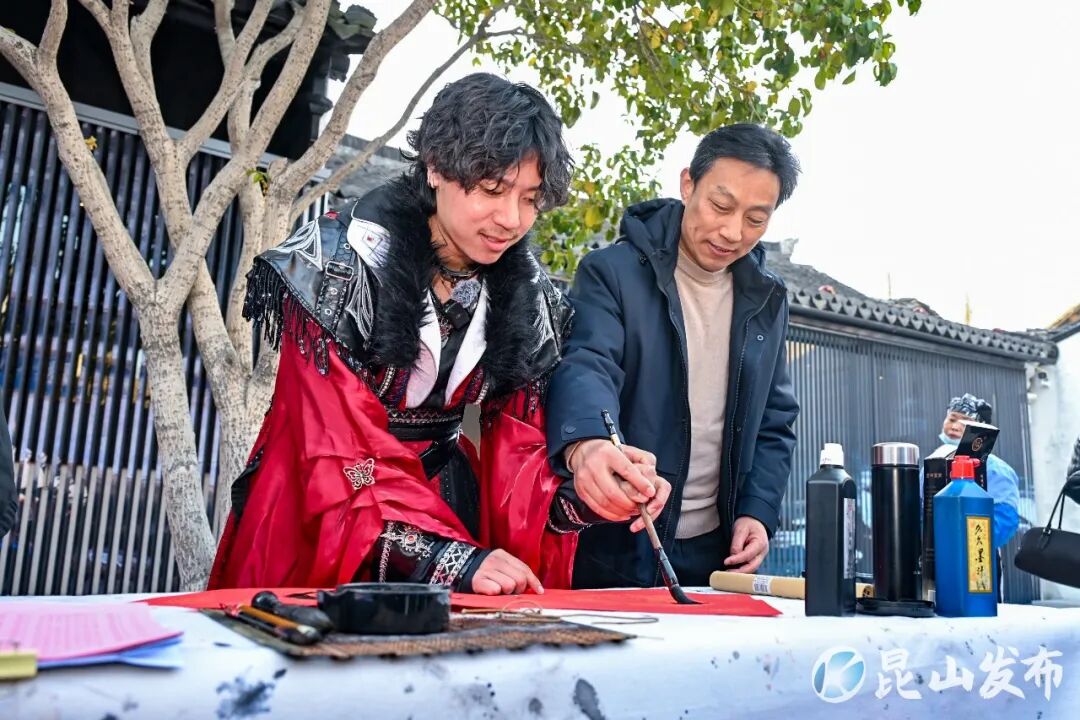 牌楼前,他加入当地非遗连厢队,跟着节奏感受水乡文化的热闹;在逸飞之家内,他提起毛笔,在红纸上亲手写下“福”字,感受着中国人迎新春的仪式感;在沈厅酒家,他与扮演“沈万三”的NPC趣味互动,在趣味对话中了解这座古镇的“财神文化”。